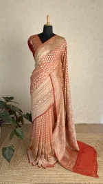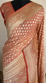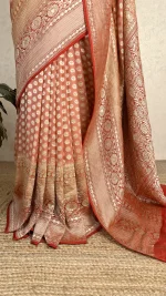 Peach Banarasi georgette saree accented with rich red borders, offering a graceful blend of softness, tradition, and festive elegance.