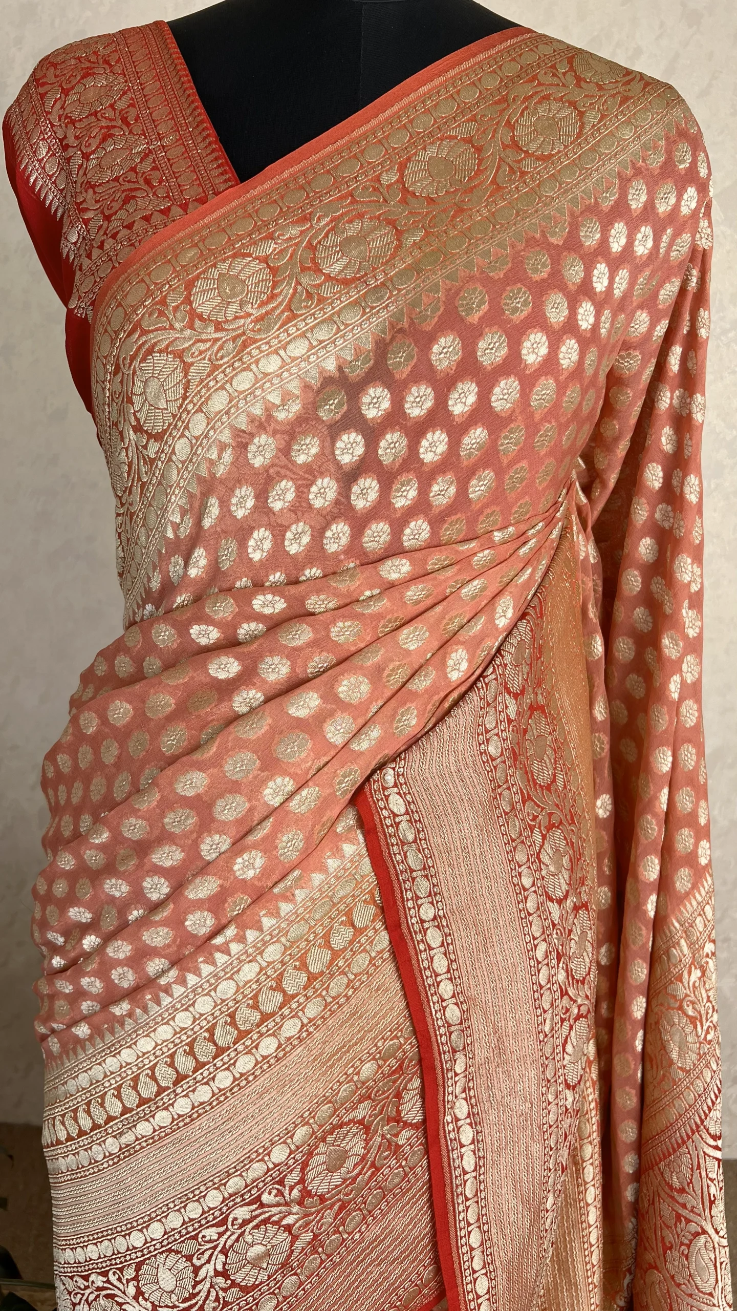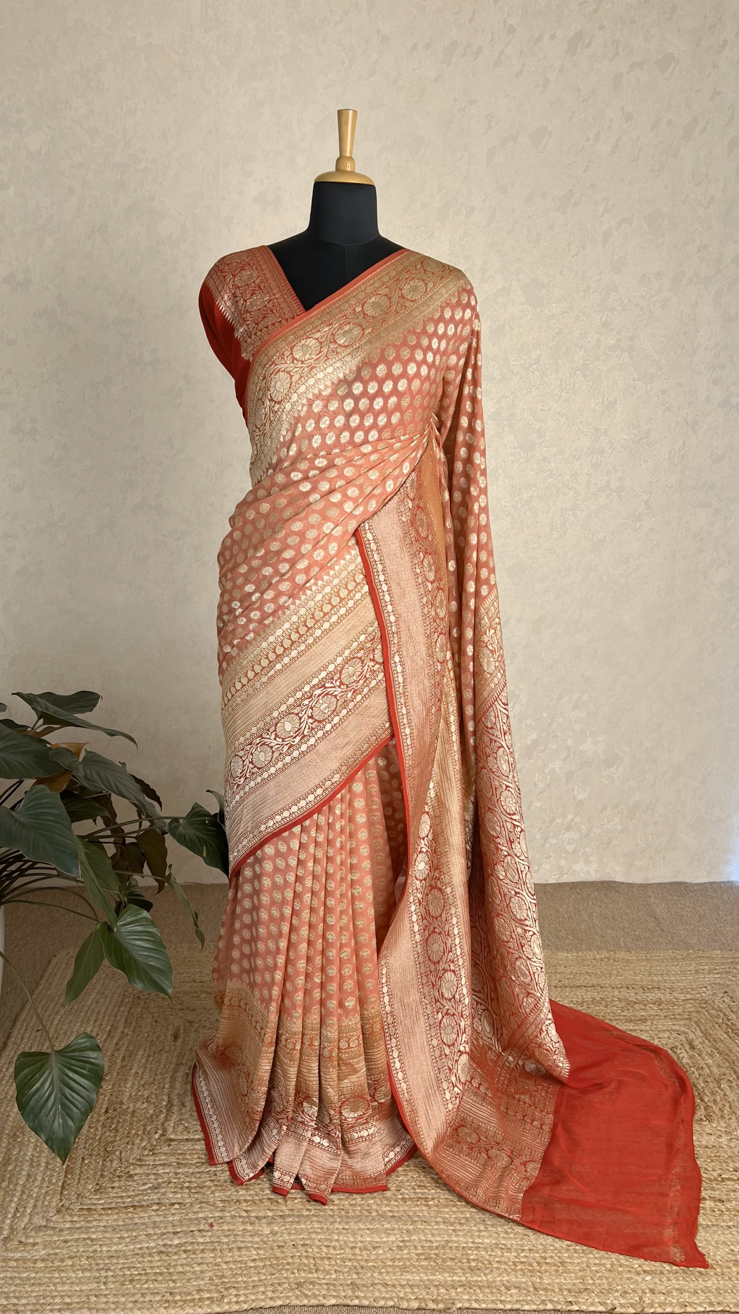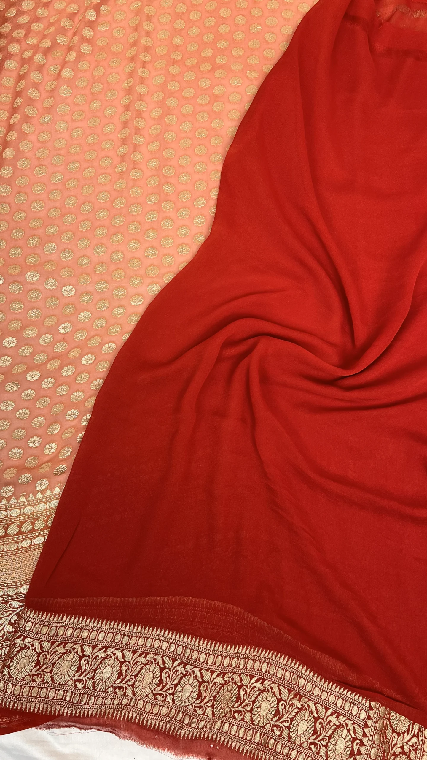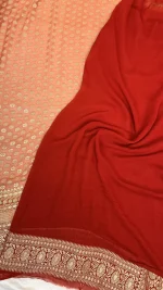 Step into timeless elegance with this peach Banarasi georgette saree, beautifully highlighted with classic red borders. Crafted from lightweight Banarasi georgette, the saree drapes effortlessly, giving a fluid and graceful silhouette while maintaining a refined festive appeal.