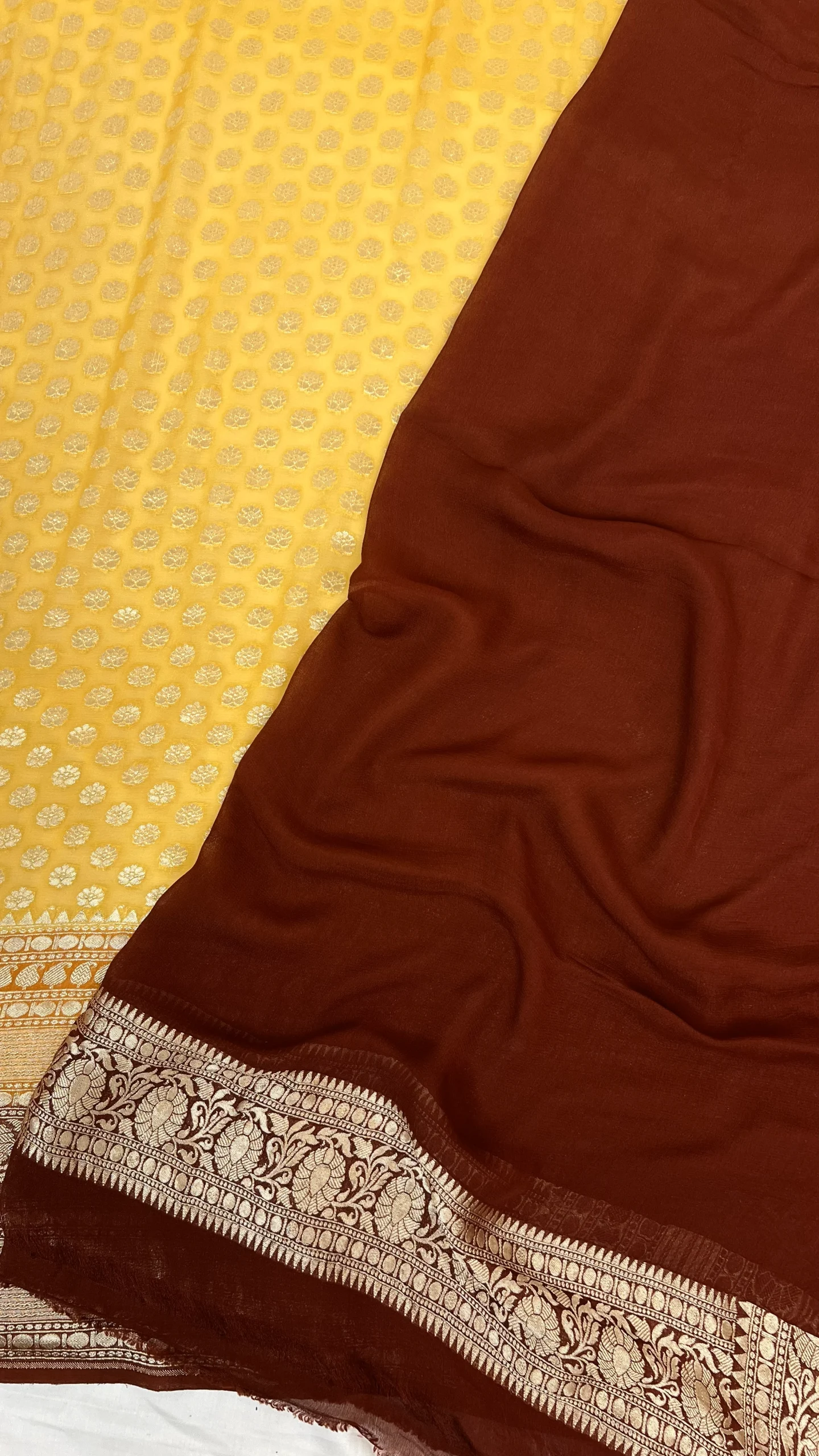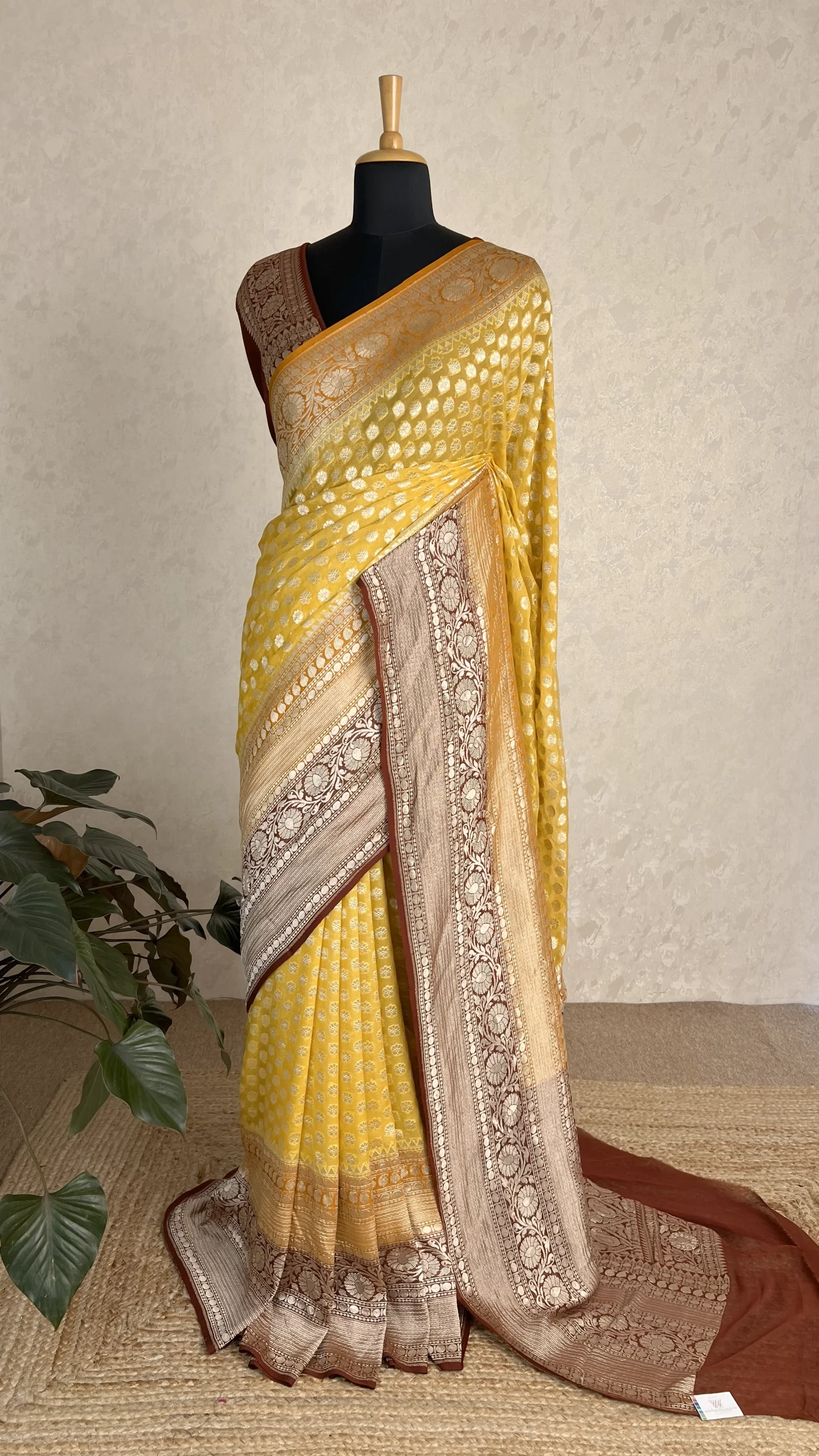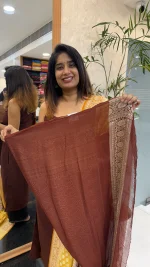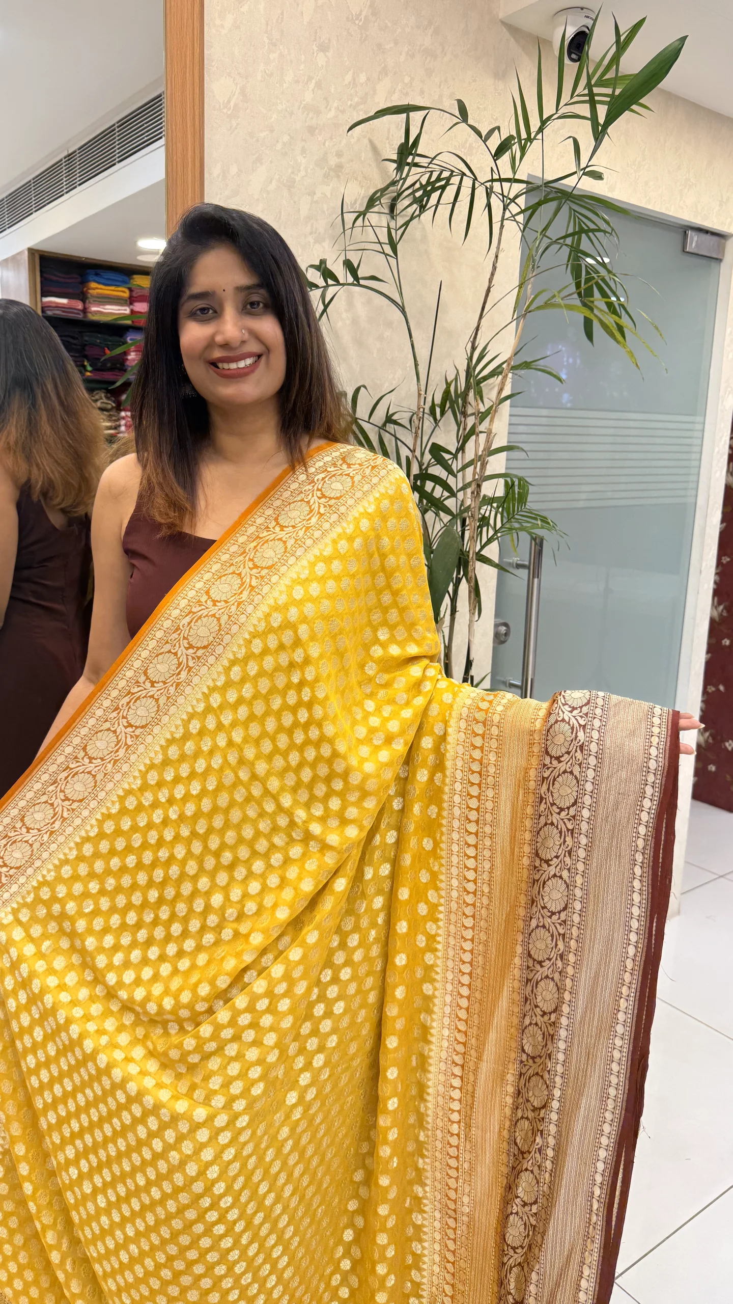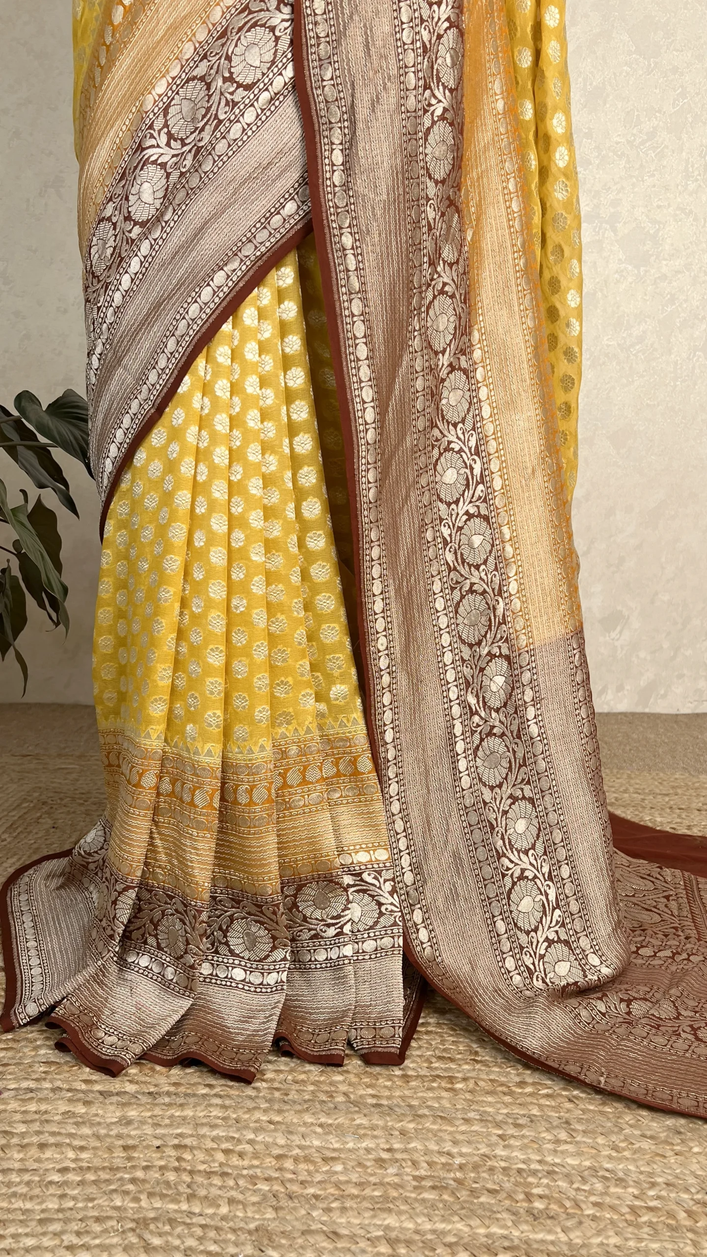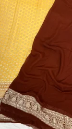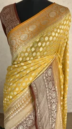 Embrace timeless tradition with this Yellow Banarasi Saree featuring a beautifully contrasted brown pallu. Crafted using authentic Banarasi weaving techniques, this saree reflects exquisite craftsmanship, rich texture, and a graceful drape.
