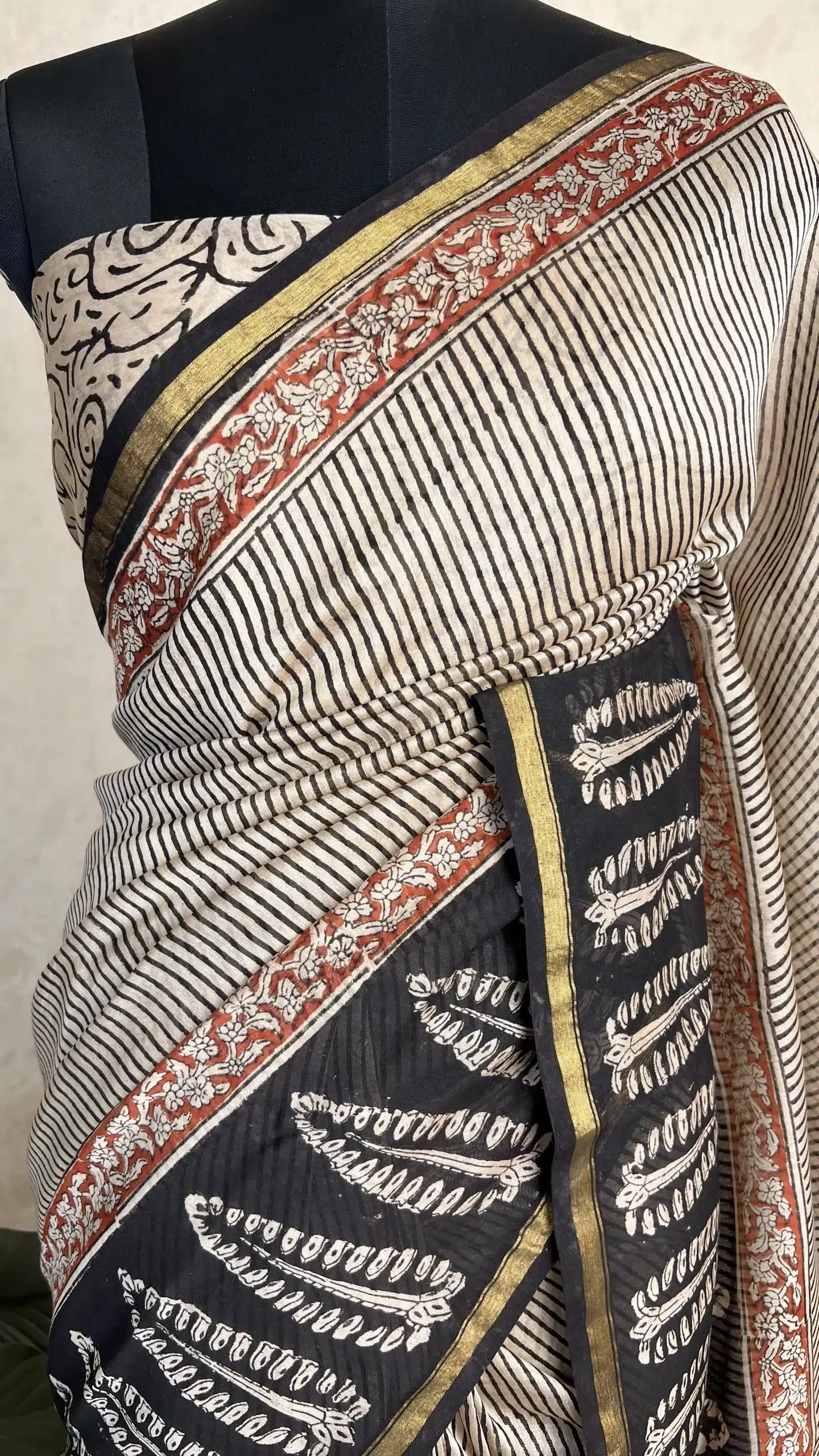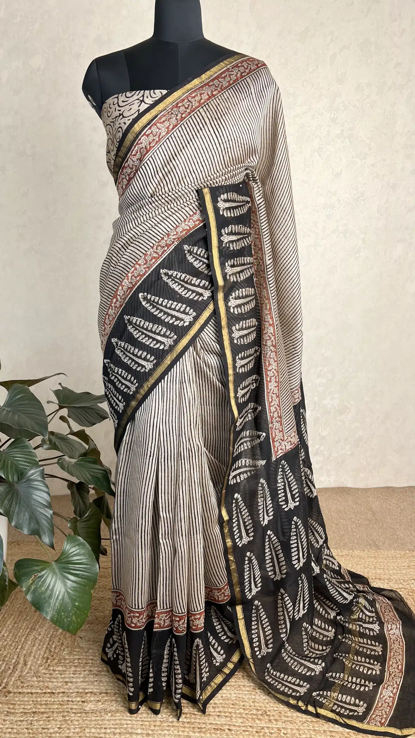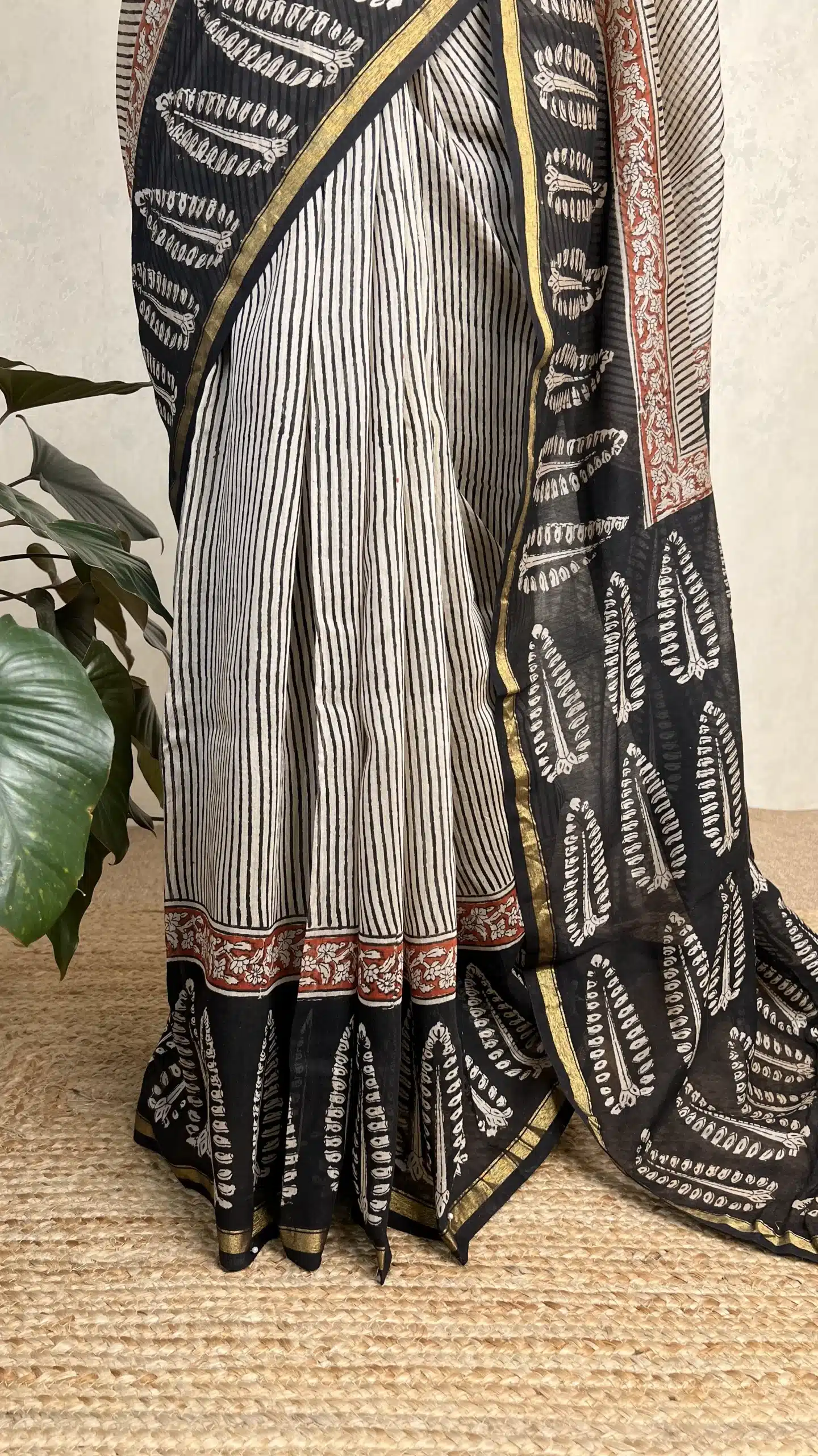 Adding to its charm is a striking black border detailed with intricate hand block prints, reflecting traditional craftsmanship. Delicate thin zari accents along the borders lend a graceful finishing touch. Ideal for office wear, cultural gatherings, and daytime occasions, this saree effortlessly blends simplicity, tradition, and timeless elegance.