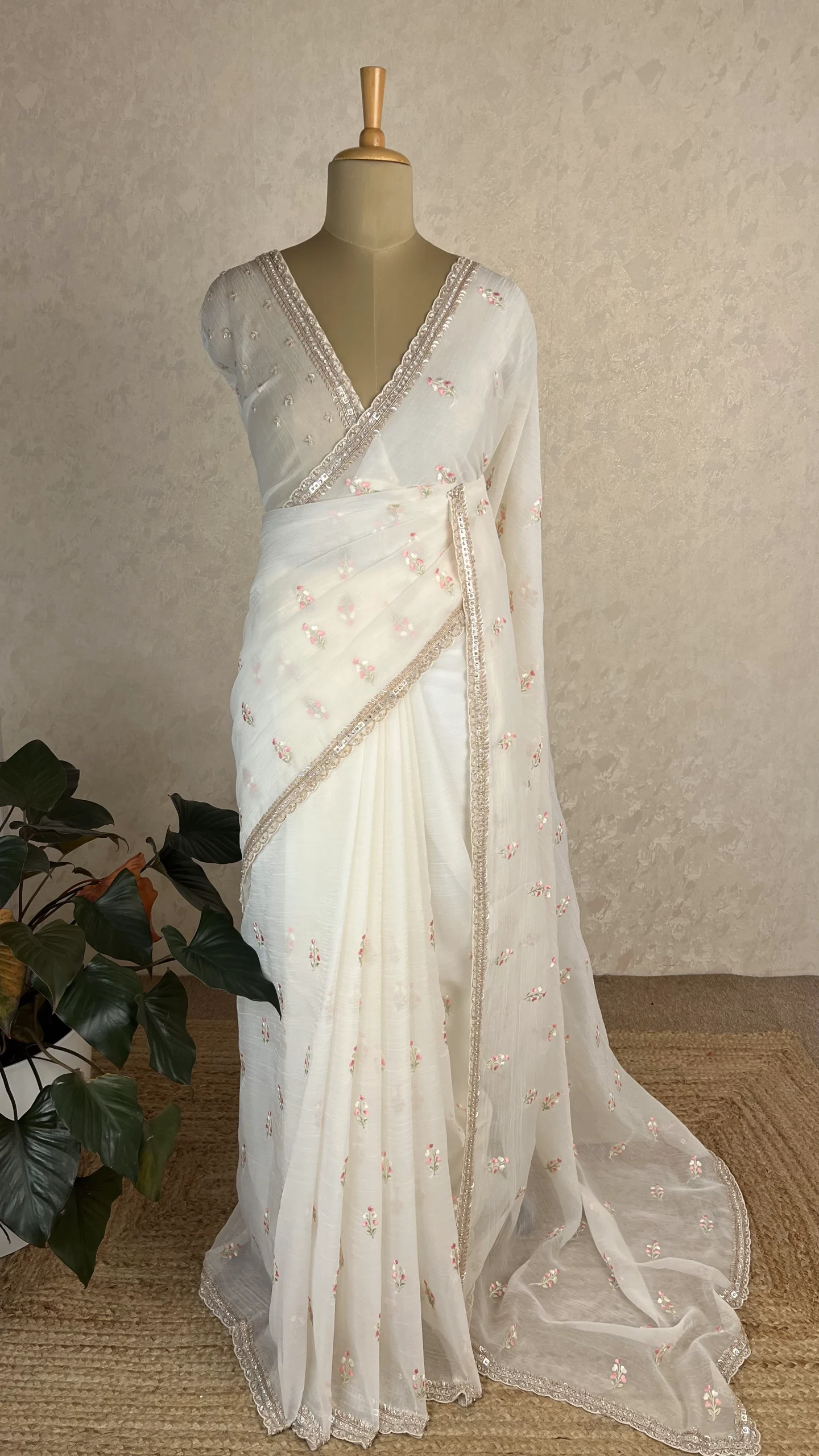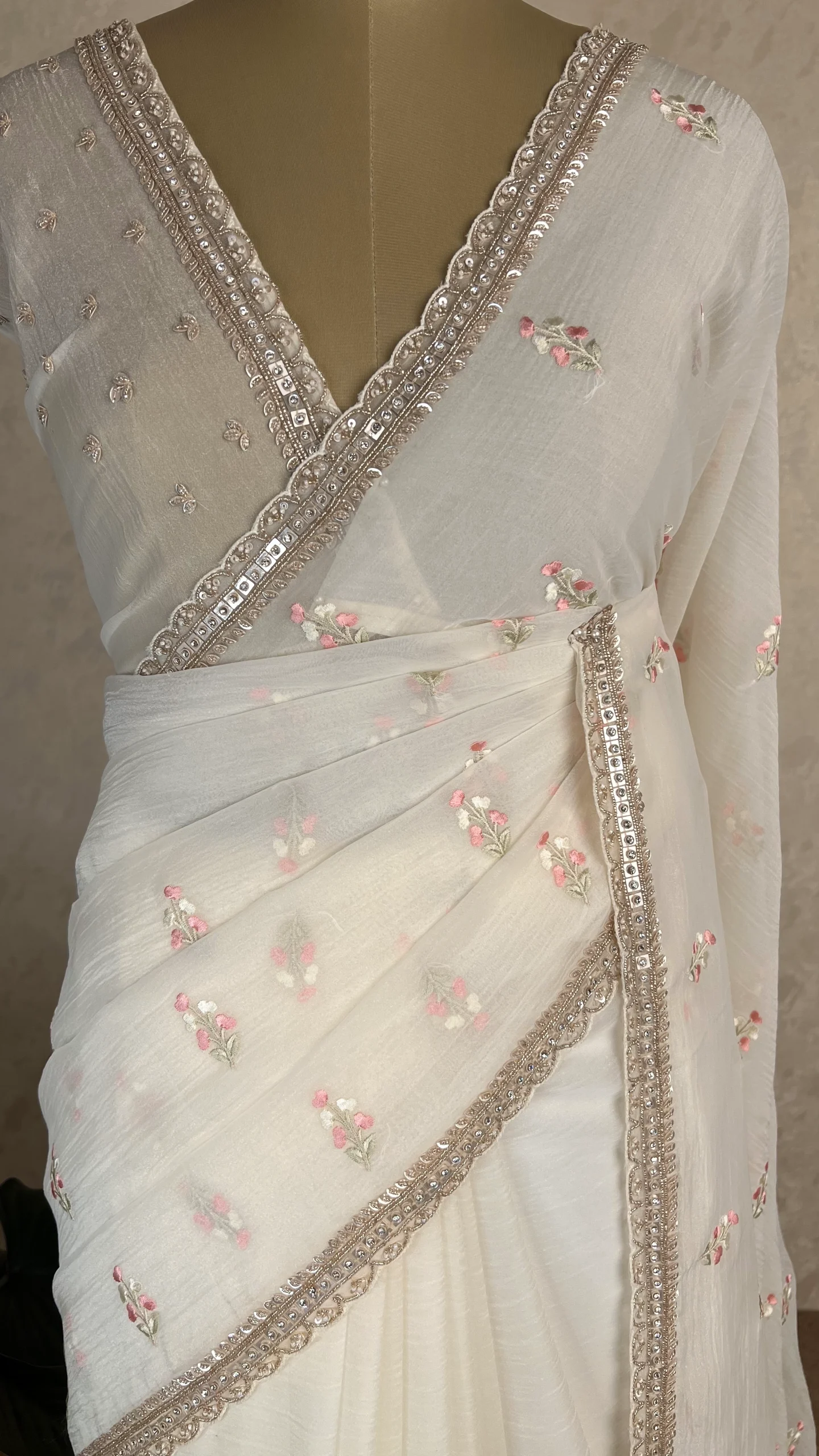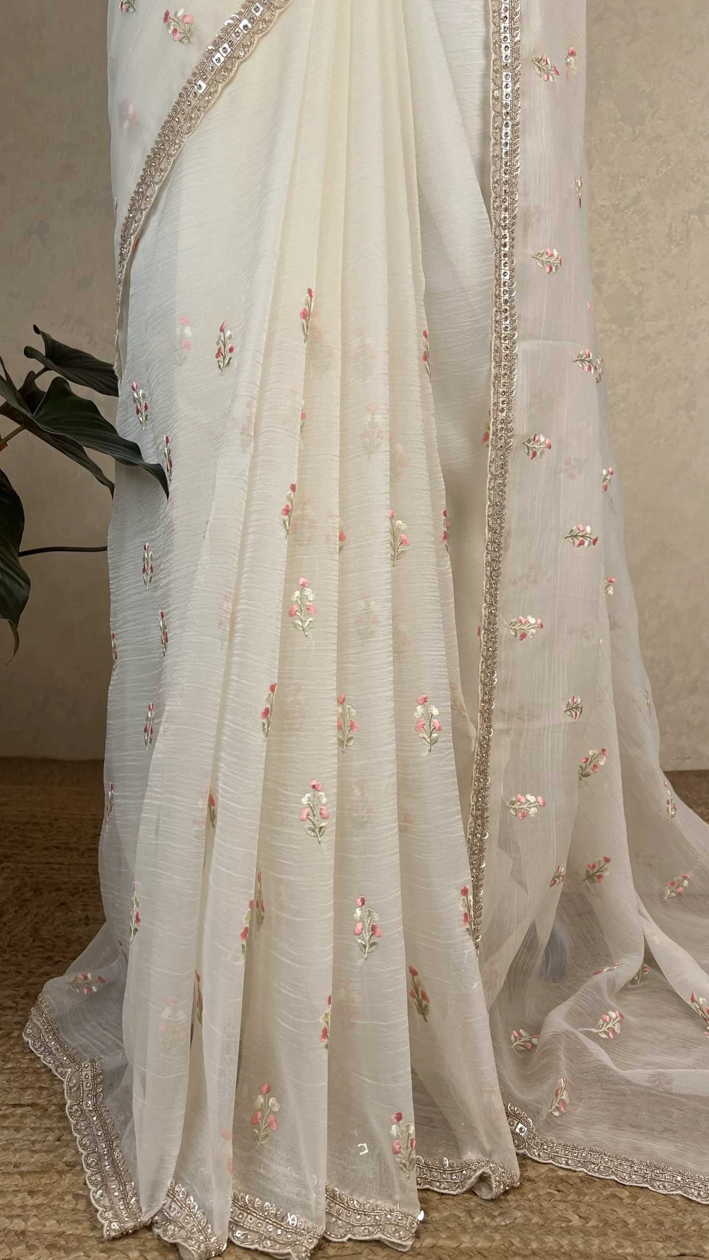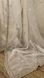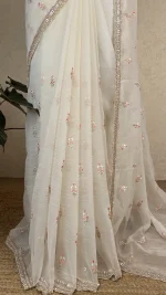 Elegant crush organza saree in a white  hue, adorned with delicate floral embroidery and a beautifully hand-worked embellished border—perfect for festive and special occasions.
