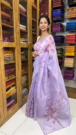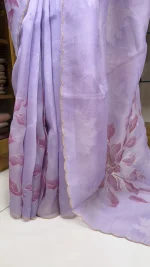 Elevate your elegance with our Lavender Floral Organza Silk Saree, featuring delicate floral prints, intricate peeta work highlights, and a scalloped border for a refined touch of tradition