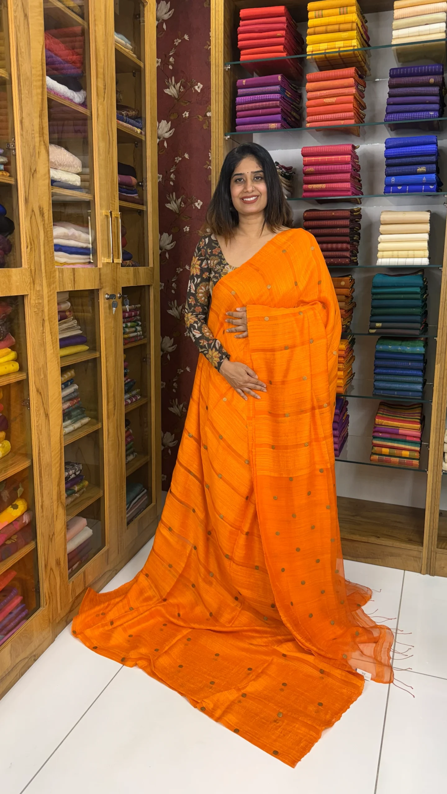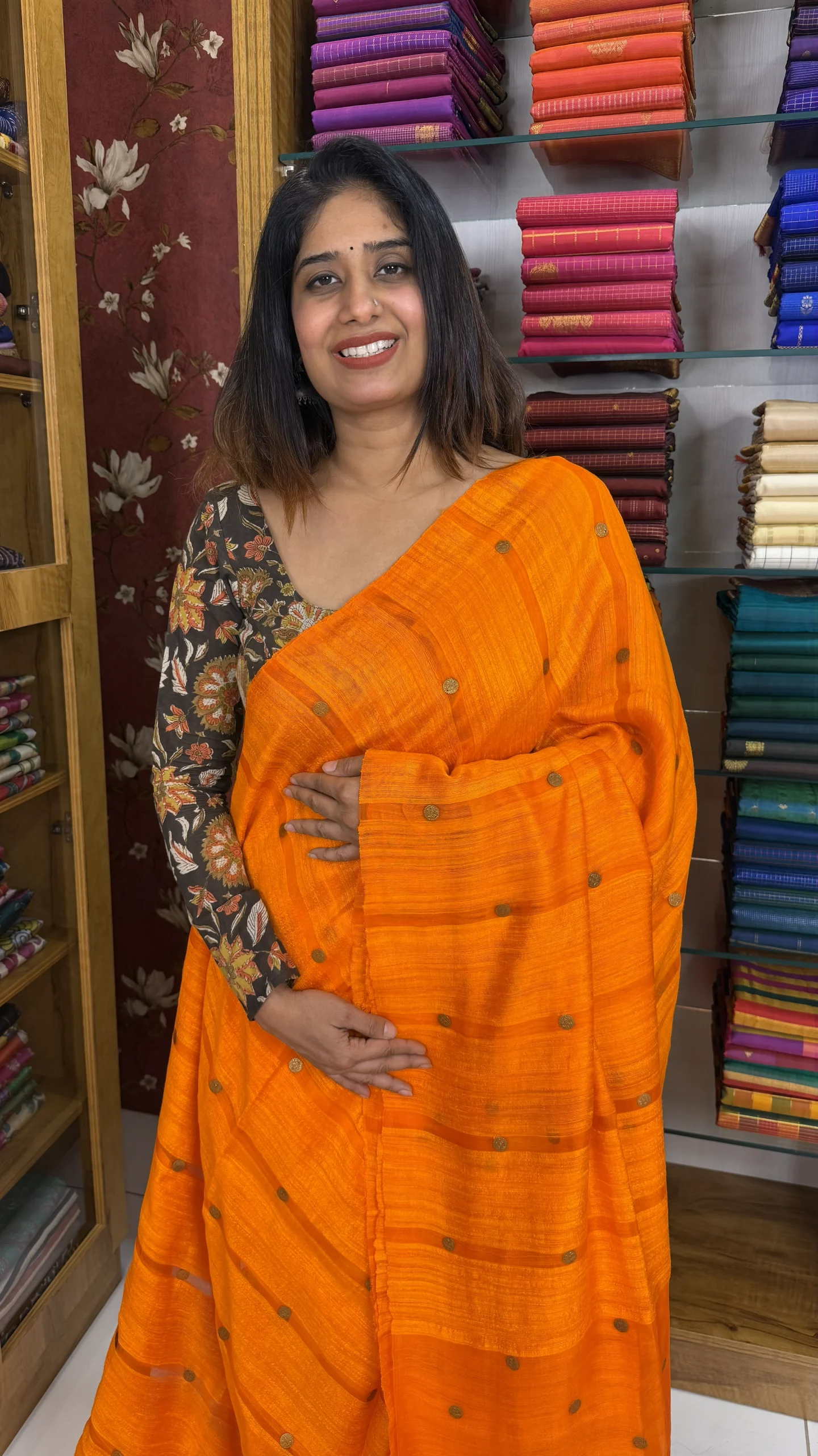The highlight of this saree lies in its delicate coin motifs, thoughtfully woven to add a hint of shimmer and artisanal charm without overpowering the design. The radiant Orange hue enhances its festive appeal, making it an ideal choice for celebrations, poojas, daytime weddings, and cultural gatherings.