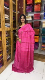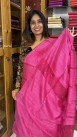 Make a subtle yet striking statement with this Rani Pink Matka Muslin Saree with Coin Detailing. Handwoven from premium Matka Muslin fabric, the saree features a soft, breathable texture with a naturally elegant drape that feels light and comfortable throughout the day.