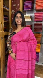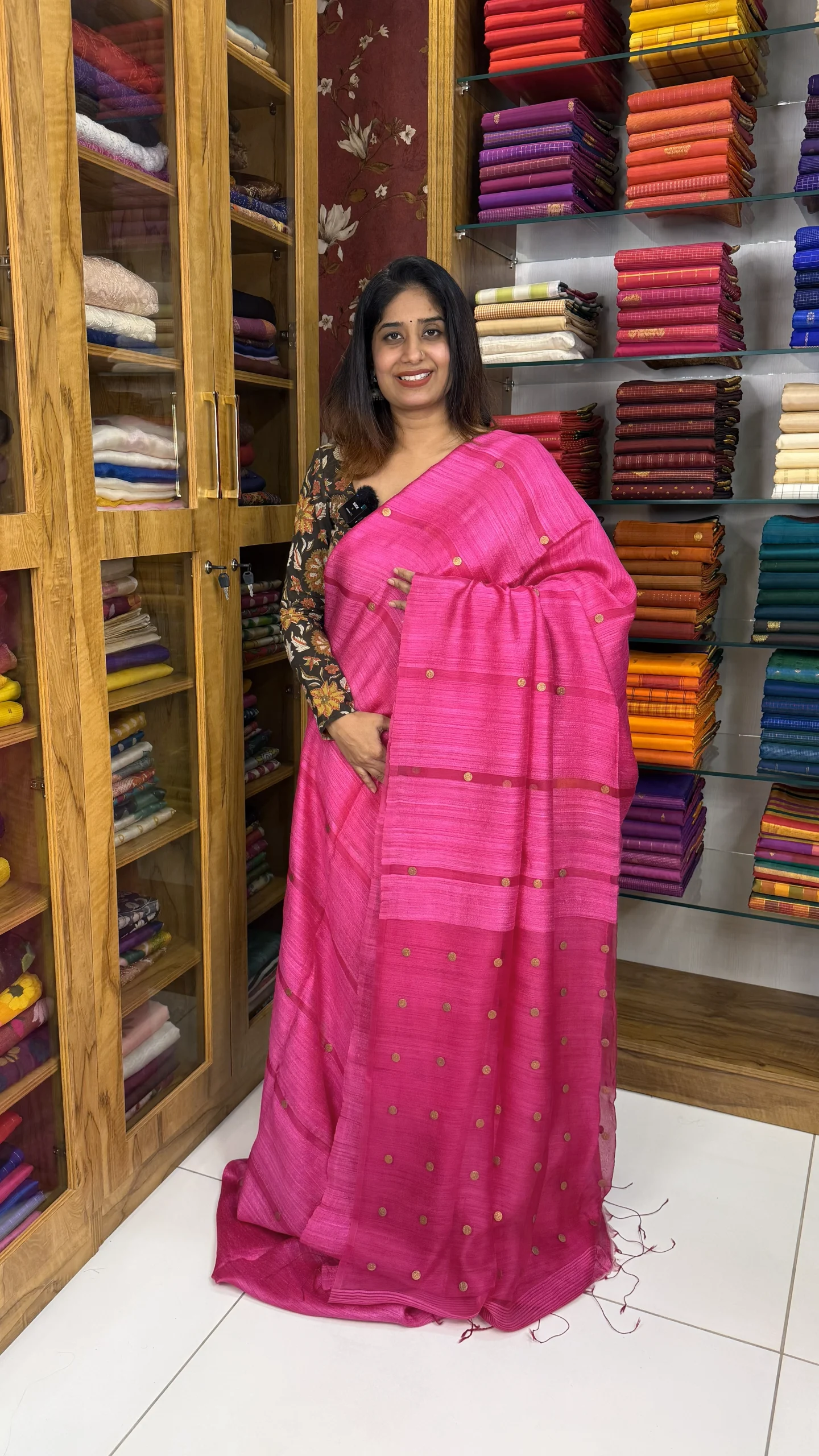 The highlight of this saree lies in its delicate coin motifs, thoughtfully woven to add a hint of shimmer and artisanal charm without overpowering the design. The radiant Rani Pink hue enhances its festive appeal, making it an ideal choice for celebrations, poojas, daytime weddings, and cultural gatherings.