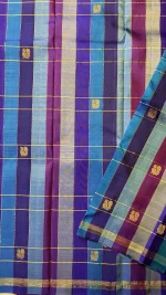 Complementing the saree is a striking blouse piece in a rich dual shade of purple and magenta, adding depth and contrast to the overall look. This thoughtful combination enhances the saree’s elegance and makes styling effortless.