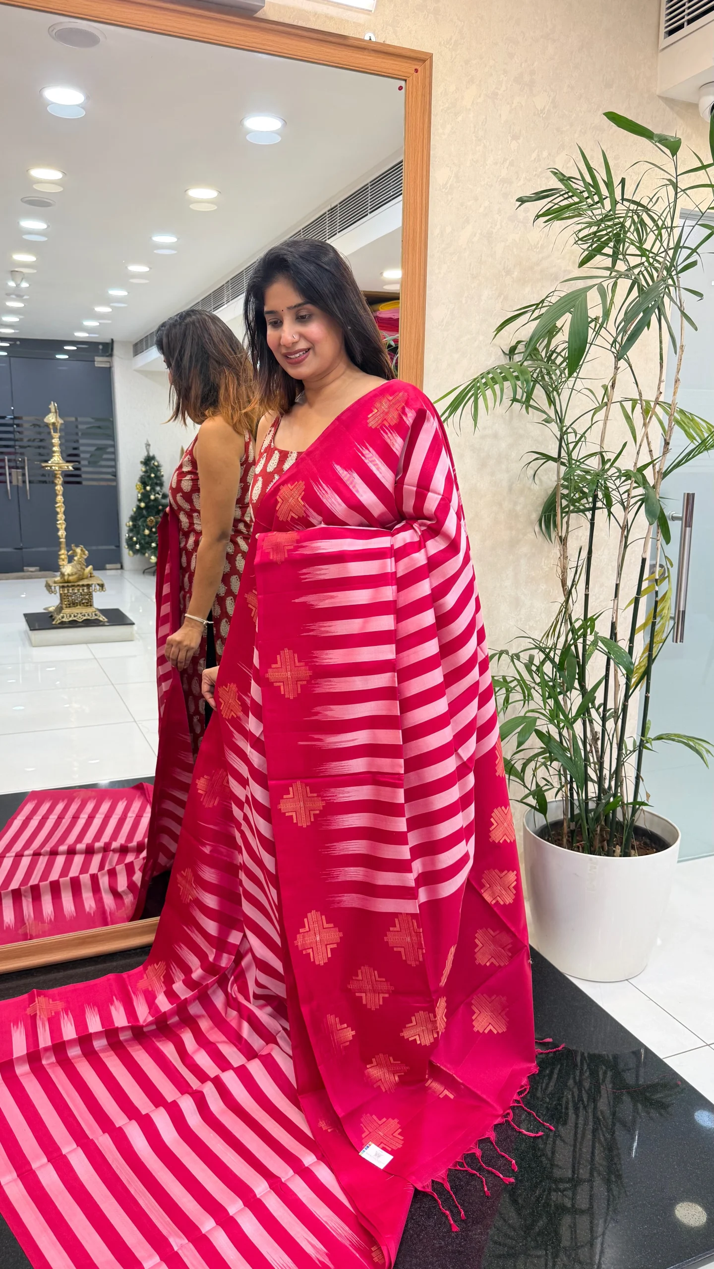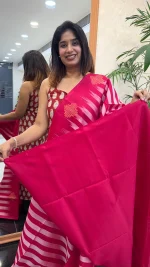 Add timeless elegance to your ethnic collection with this stunning Rani Pink Kanchipuram Soft Silk Saree. The saree showcases a rich rani pink base beautifully enhanced with soft light pink vertical lines, creating a sophisticated and elongating visual appeal.