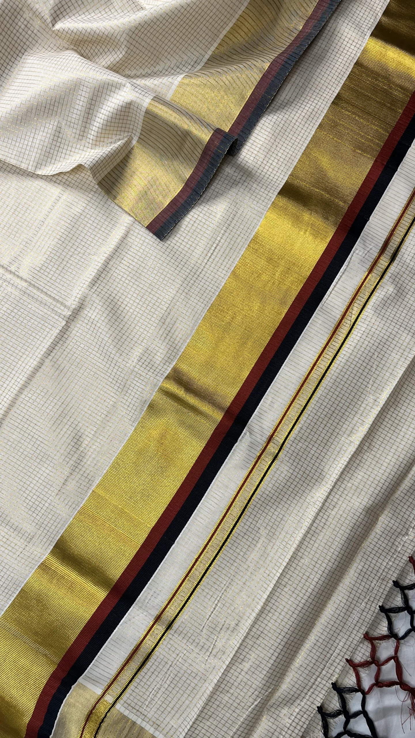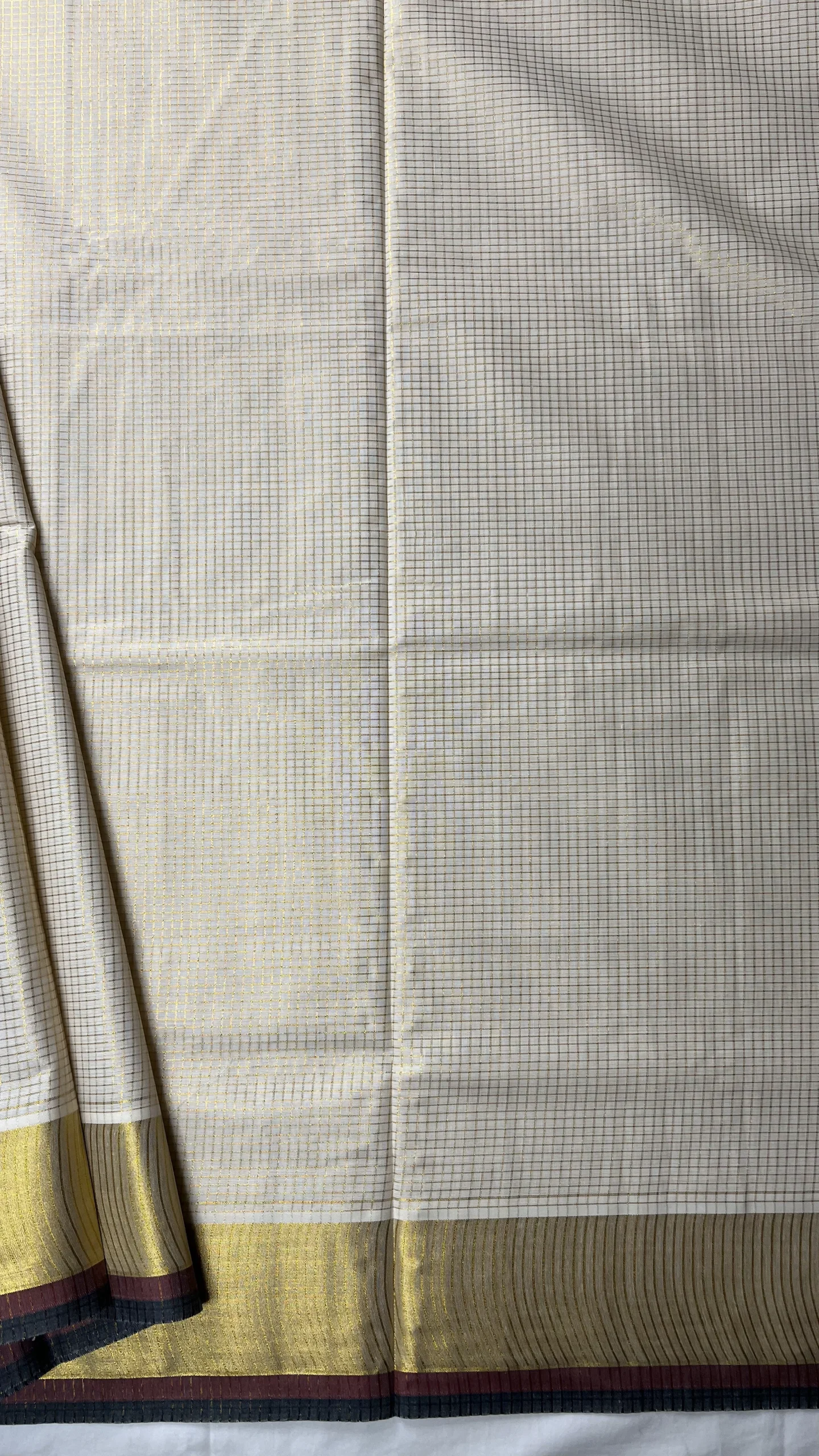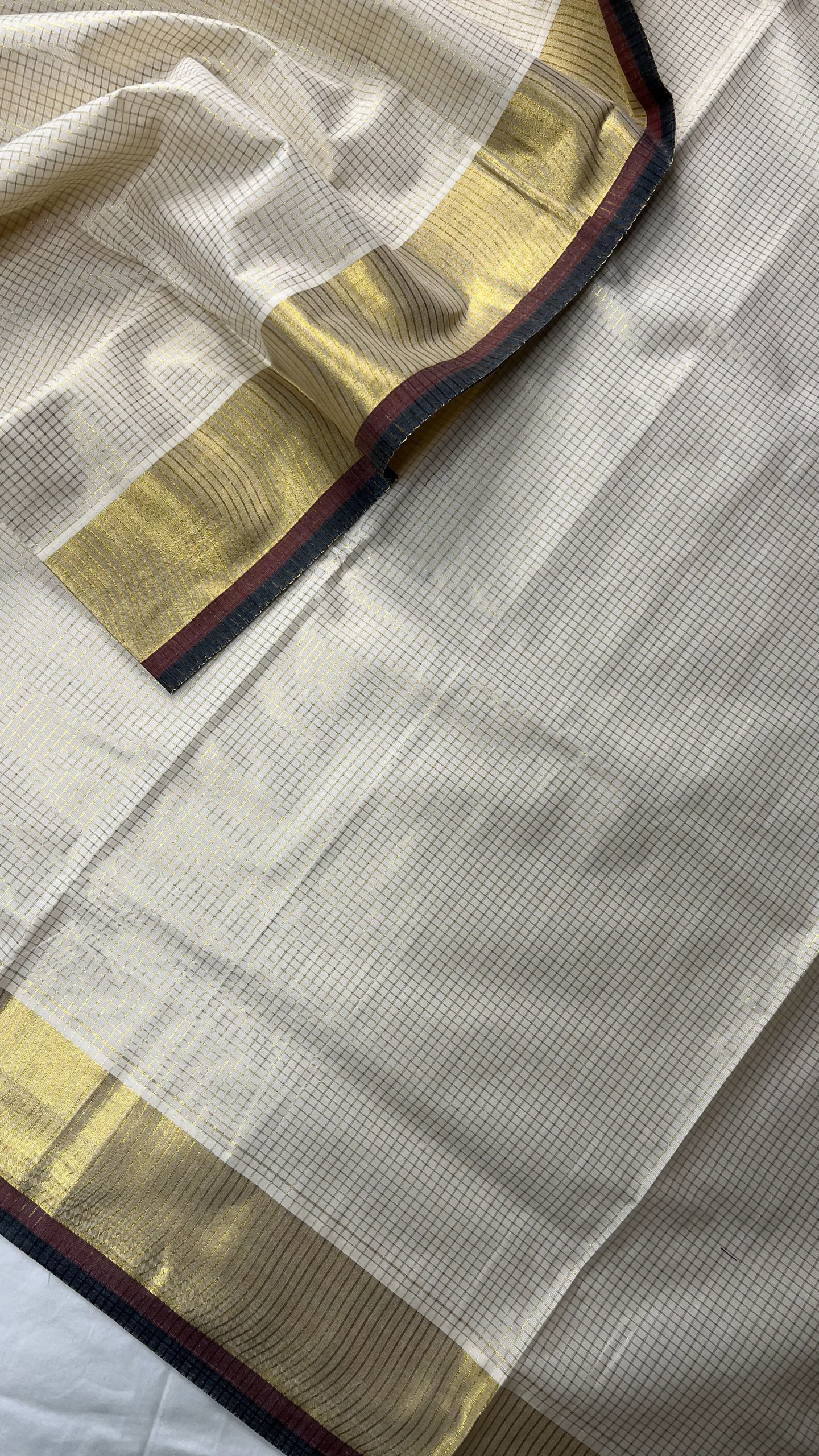 Elegant off-white Kerala saree featuring fine gold zari check pattern, enhanced with a vibrant black and maroon border.