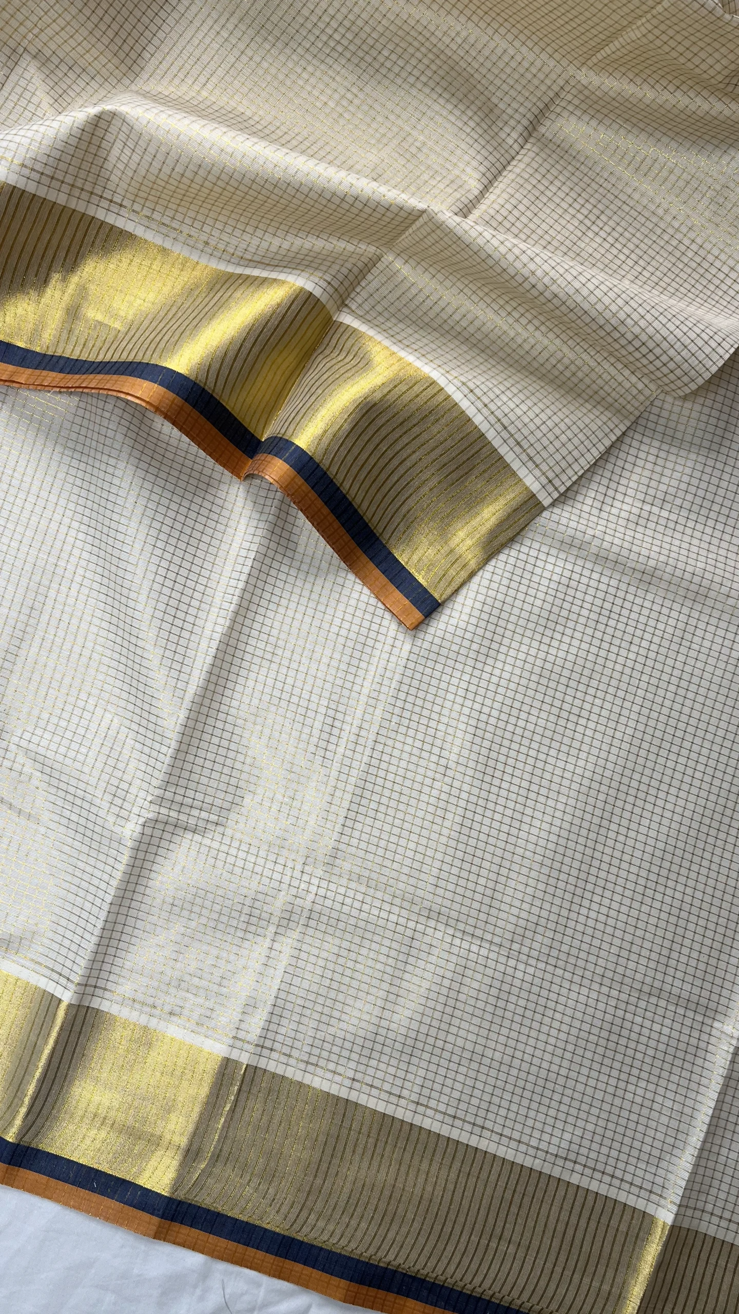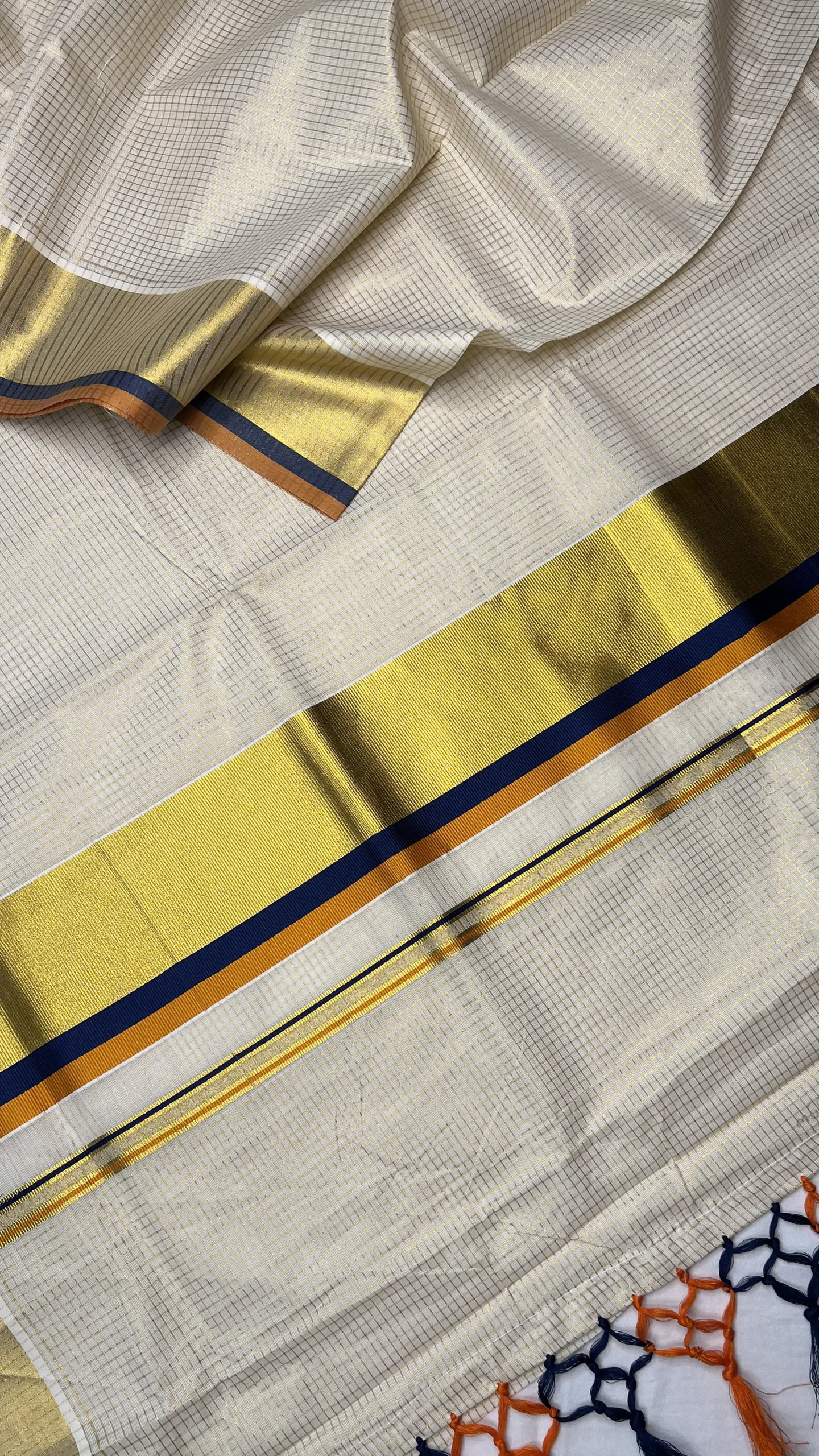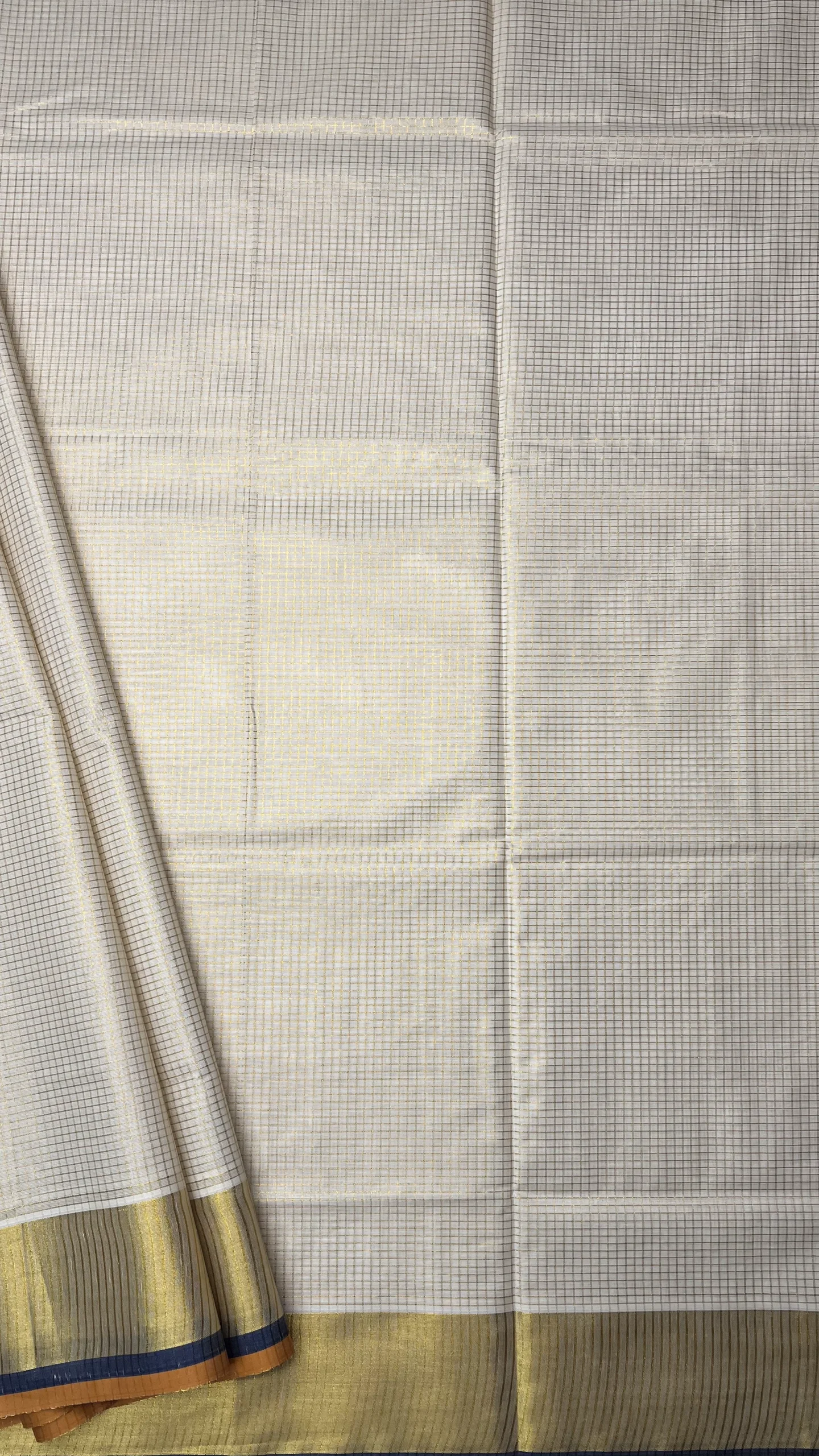 Elegant off-white Kerala saree featuring fine gold zari check pattern, enhanced with a vibrant royal blue and orange border.