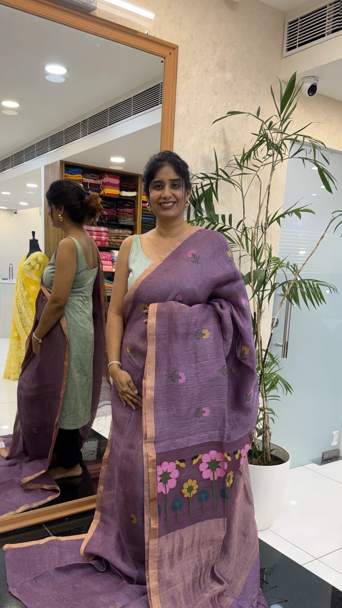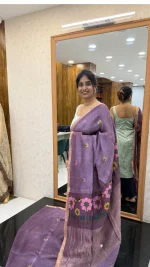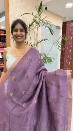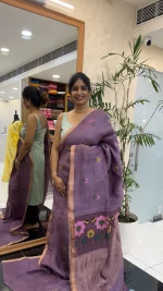 Make a graceful statement with this stunning light lilac linen silk saree, intricately woven with soft pink and yellow floral lotus patterns that span the body. The saree is further enhanced with large jamdani floral lotus weaves along the borders, creating a perfect blend of traditional craftsmanship and contemporary elegance. The lightweight and luxurious fabric drapes beautifully, offering both comfort and sophistication for any occasion. Whether you’re attending a festive event or a formal gathering, this saree promises to turn heads with its intricate design and timeless beauty.