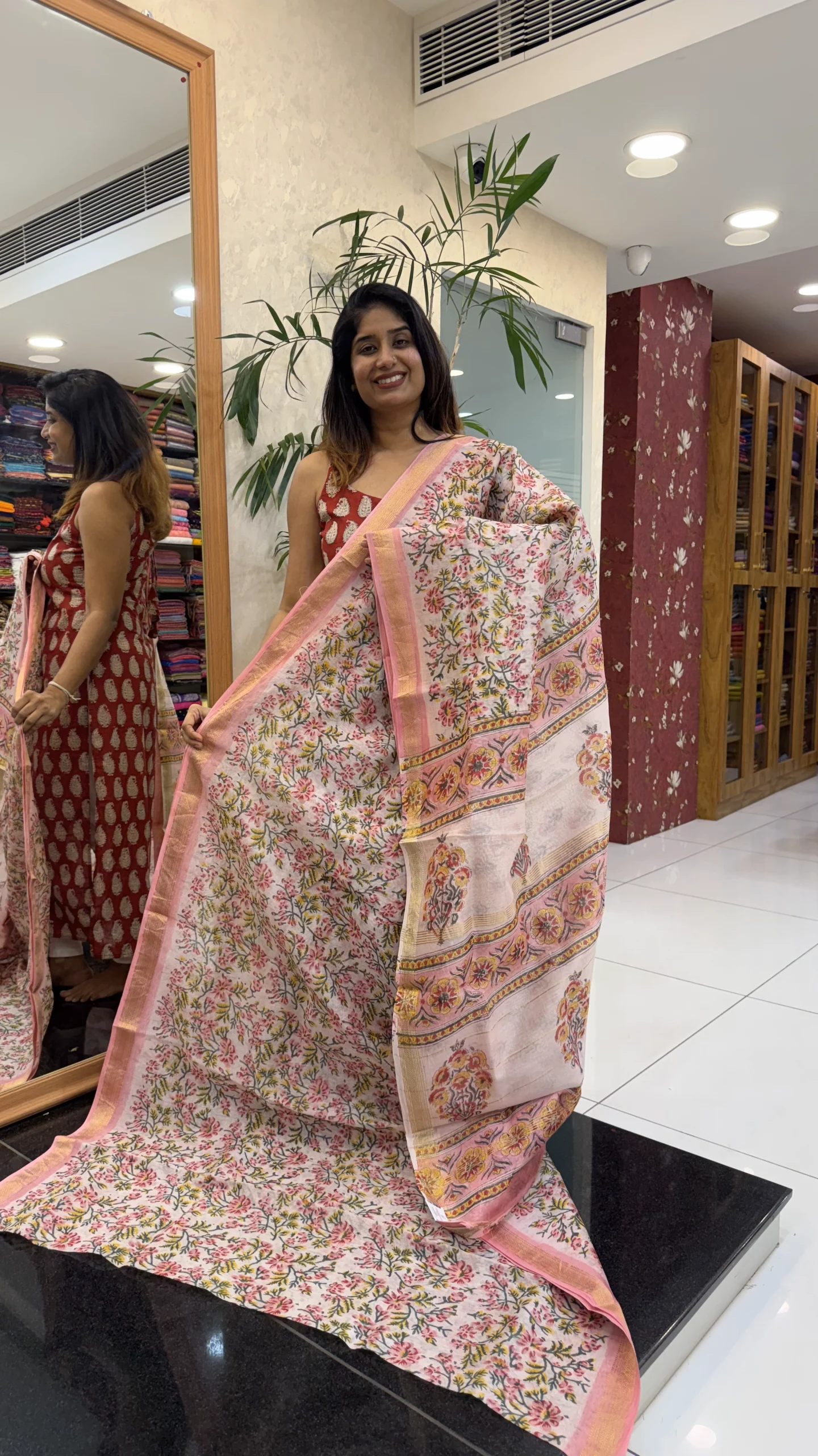 Graceful pastel pink saree featuring delicate floral prints and a subtle gold-toned zari border. Lightweight, elegant, and perfect for everyday wear or casual occasions.