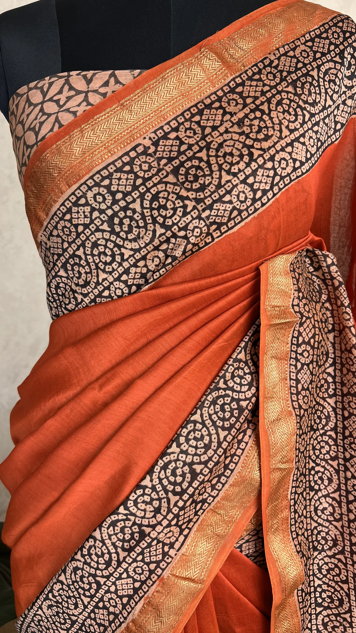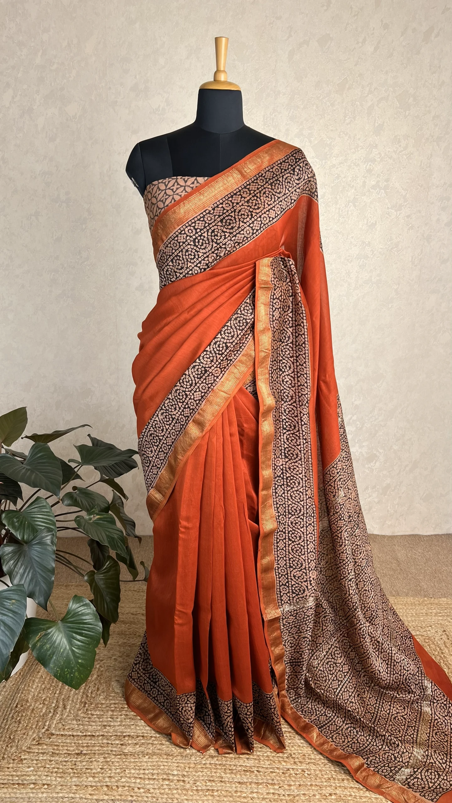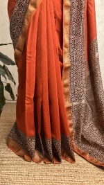 The vibrant brick orange base exudes warmth and charm, while the artisanal handblock prints add depth and timeless appeal. The zari borders enhance the elegance and give the saree a festive, sophisticated touch, making it perfect for weddings, cultural events, festivals, and casual ethnic wear.