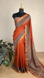 Maheshwari cotton silk saree in brick orange featuring traditional handblock prints and elegant zari borders. Lightweight, graceful, and perfect for festive or casual occasions.