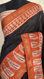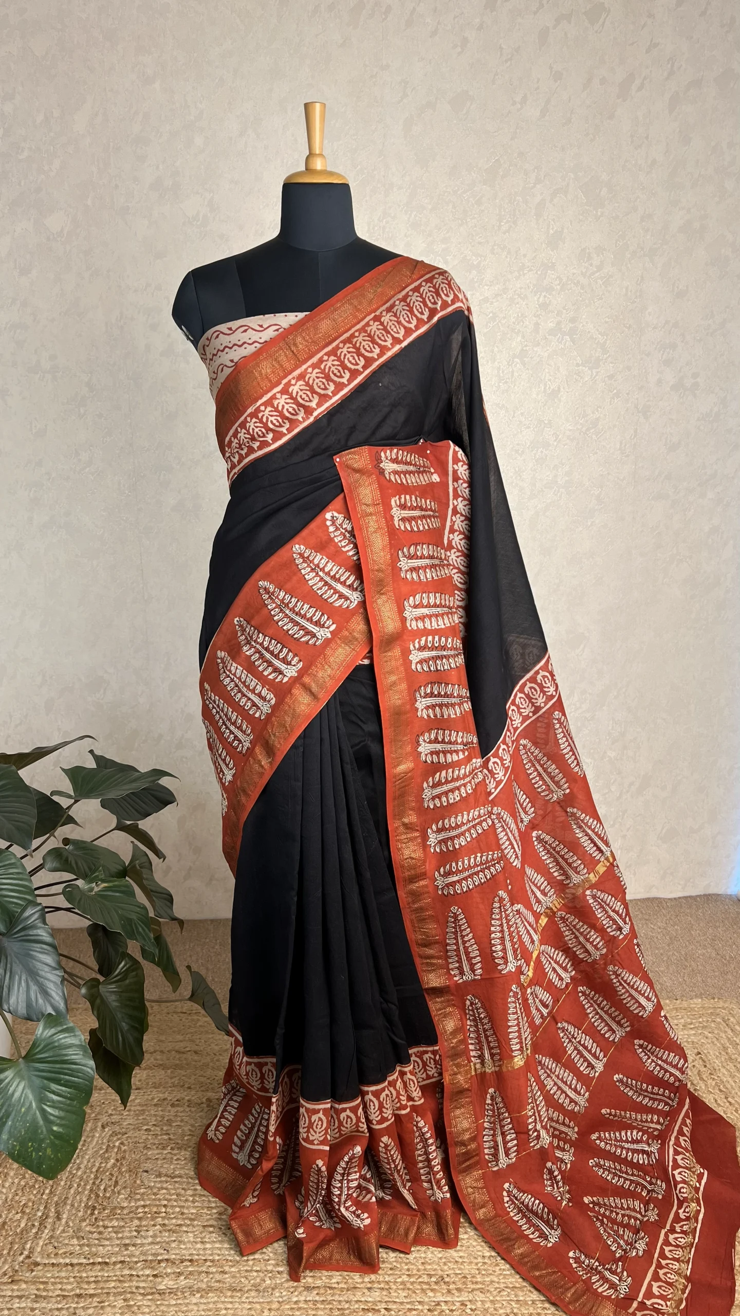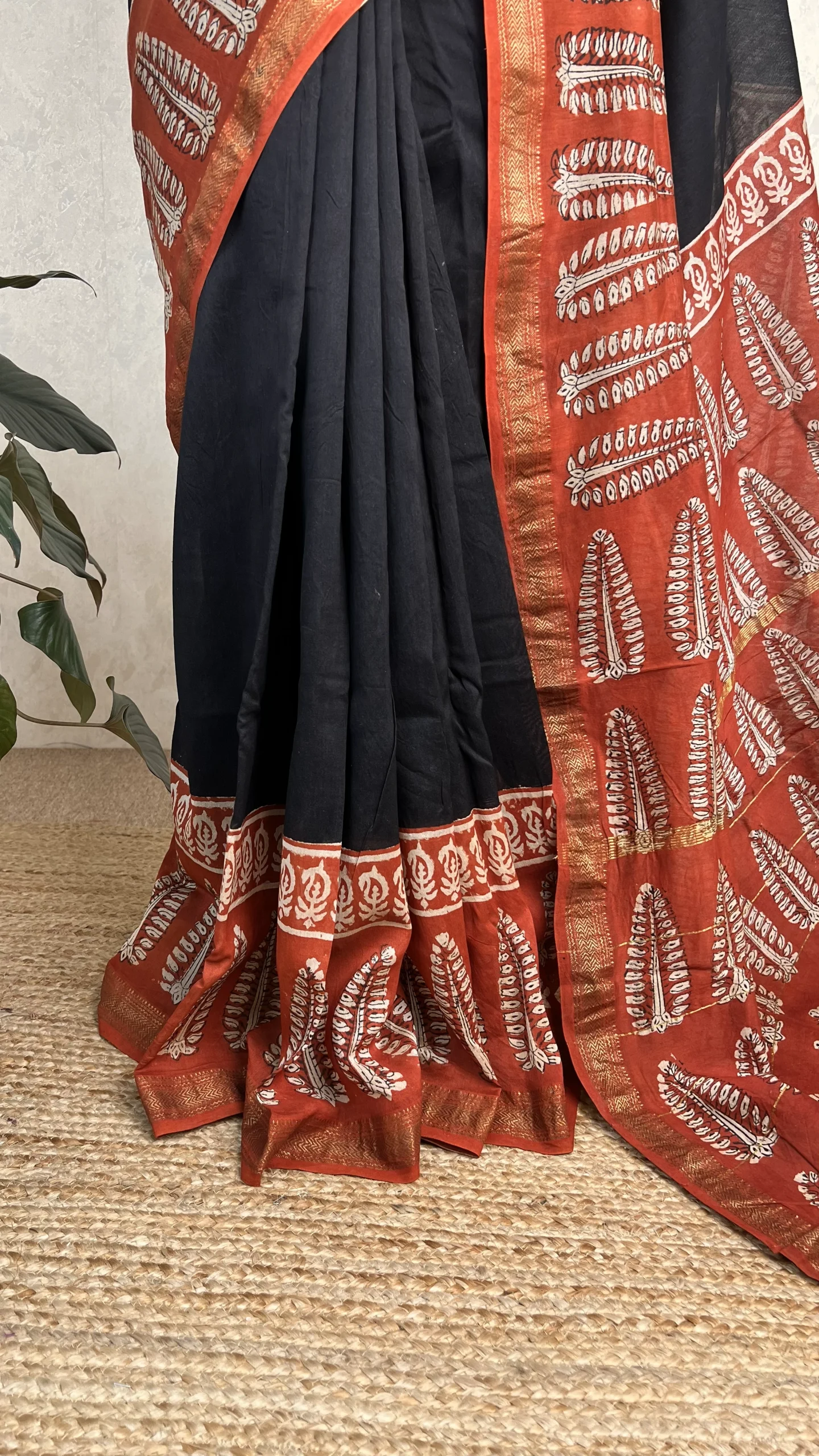 The deep black base creates a sophisticated backdrop, while the vibrant brick orange borders add warmth and festive charm. The intricate handblock prints highlight traditional craftsmanship, making this saree perfect for weddings, festivals, office events, and casual ethnic gatherings.