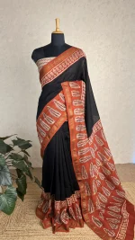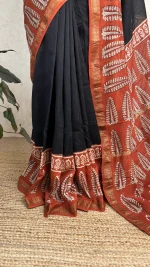 Celebrate traditional artistry with this Maheshwari Cotton Silk Saree featuring a black body and contrasting brick orange borders adorned with exquisite handblock prints. Crafted from premium cotton silk, this saree offers a soft, breathable texture and a graceful, lightweight drape for all-day comfort.