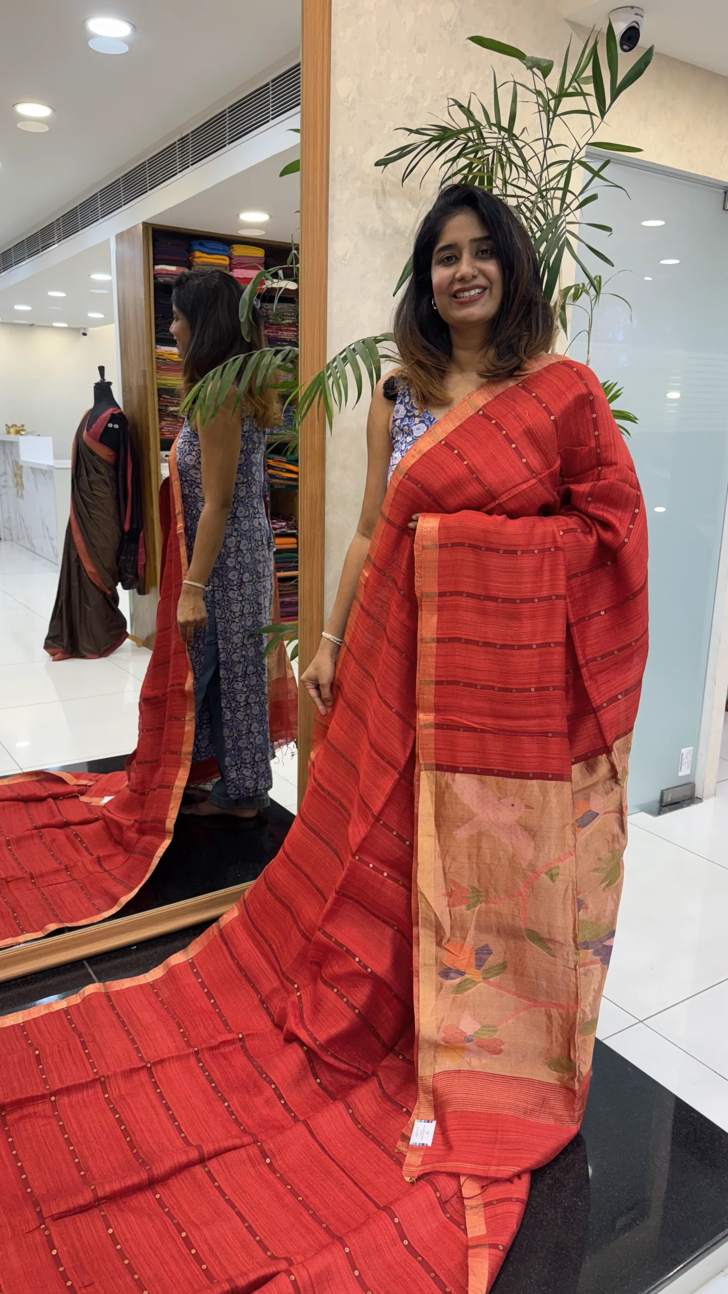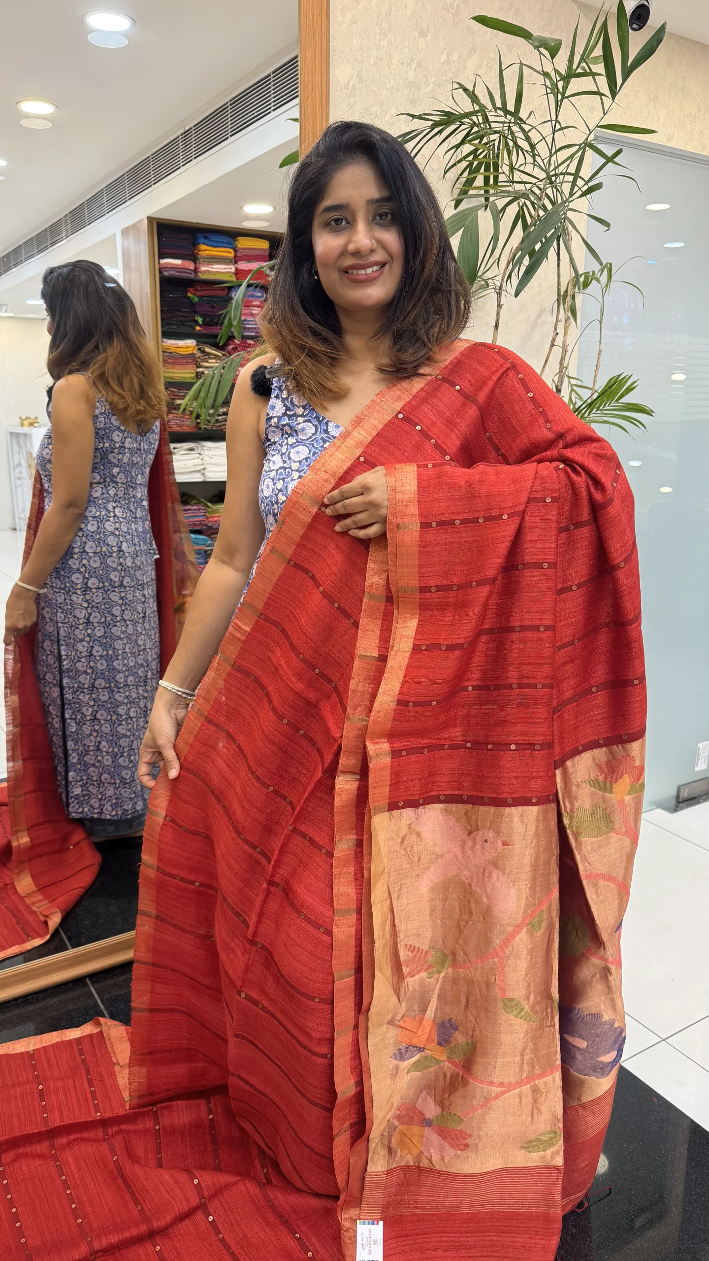 Intricately crafted with Jamdani hand weaving on the inner body, this saree showcases fine artisanal craftsmanship. The delicate pocket sequin work spread across the saree enhances its charm without overpowering its classic look.