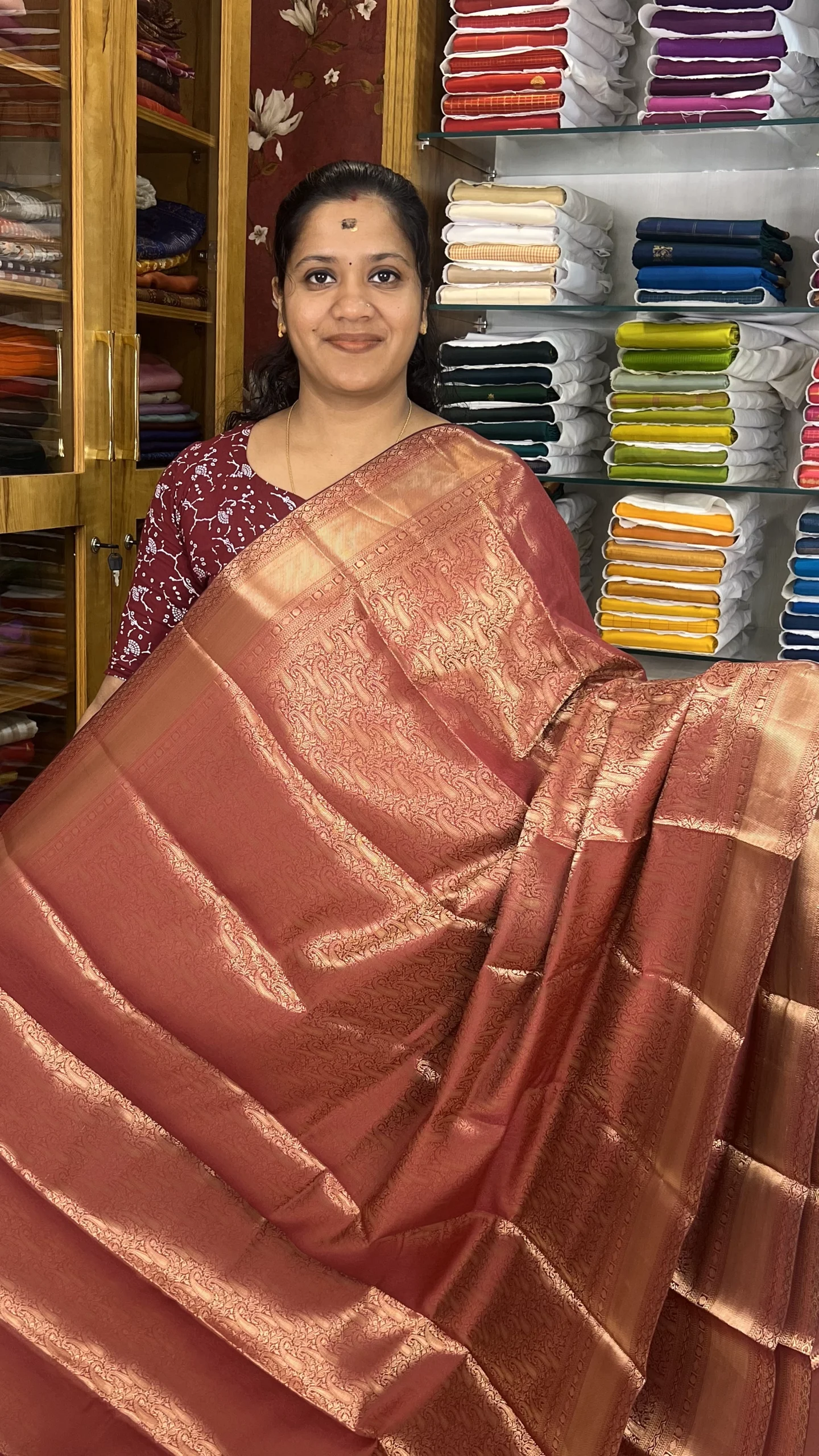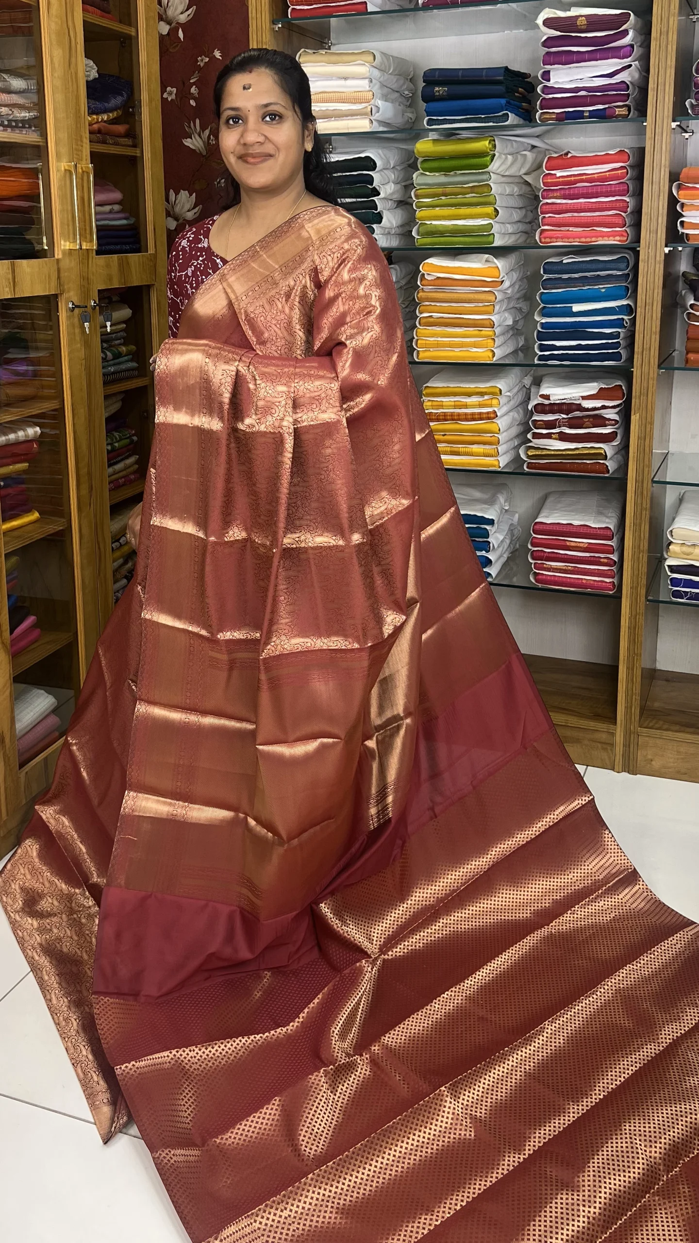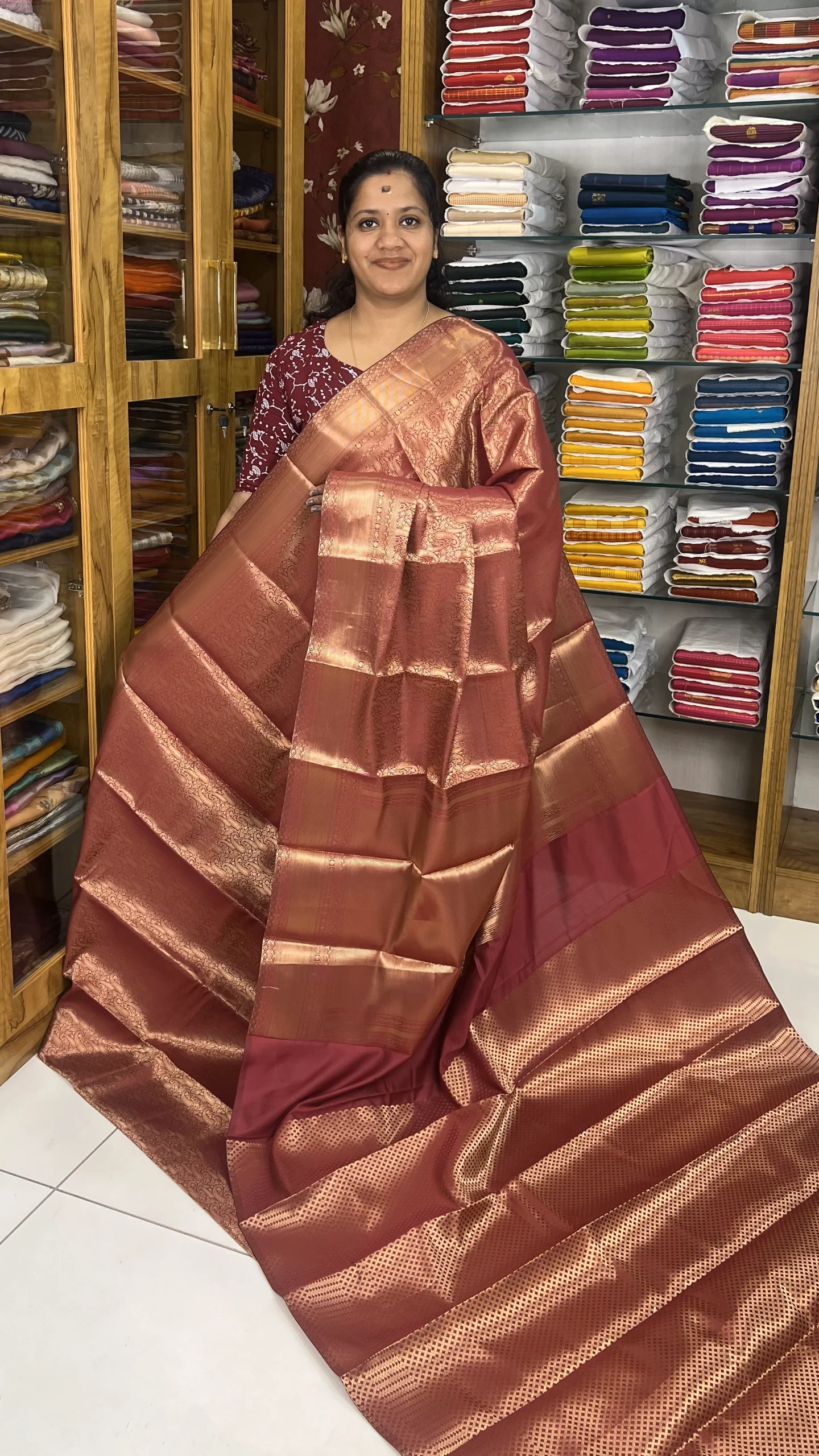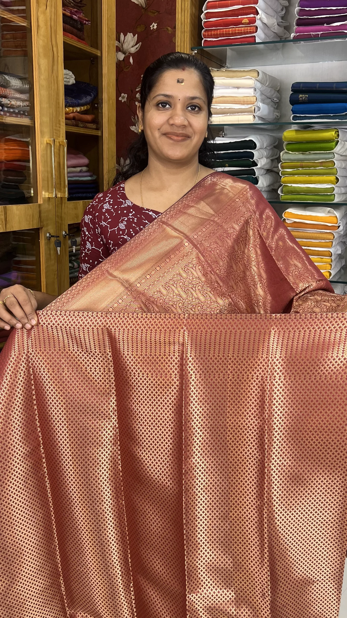 Elegant Maroonish Red saree featuring intricate gold Zari weaving, a lustrous finish, and a beautifully detailed pallu—perfect for weddings and festive occasions.