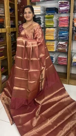 Step into timeless elegance with this exquisite Maroonish Red silk saree, designed to reflect grace and sophistication. The saree showcases a soft yet beautifully complemented by intricate gold Zari weaving that adds a luxurious sheen throughout the fabric.