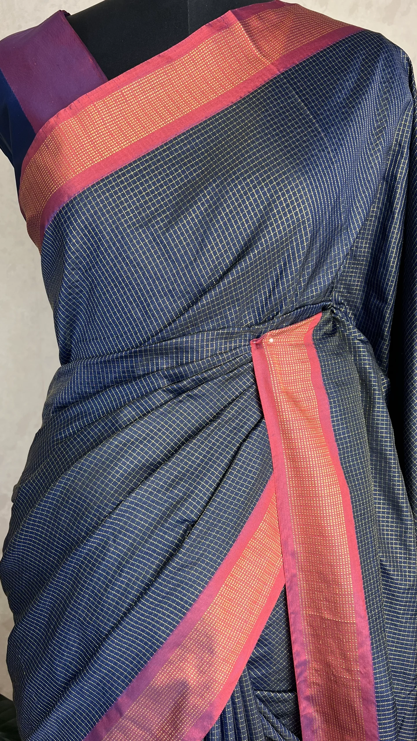 The refined micro check pattern on the navy blue base lends a classic, contemporary appeal, while the bold rani pink borders add a pop of color and festive charm. Ideal for office wear, casual gatherings, daytime functions, and special occasions, this saree beautifully balances simplicity and elegance.