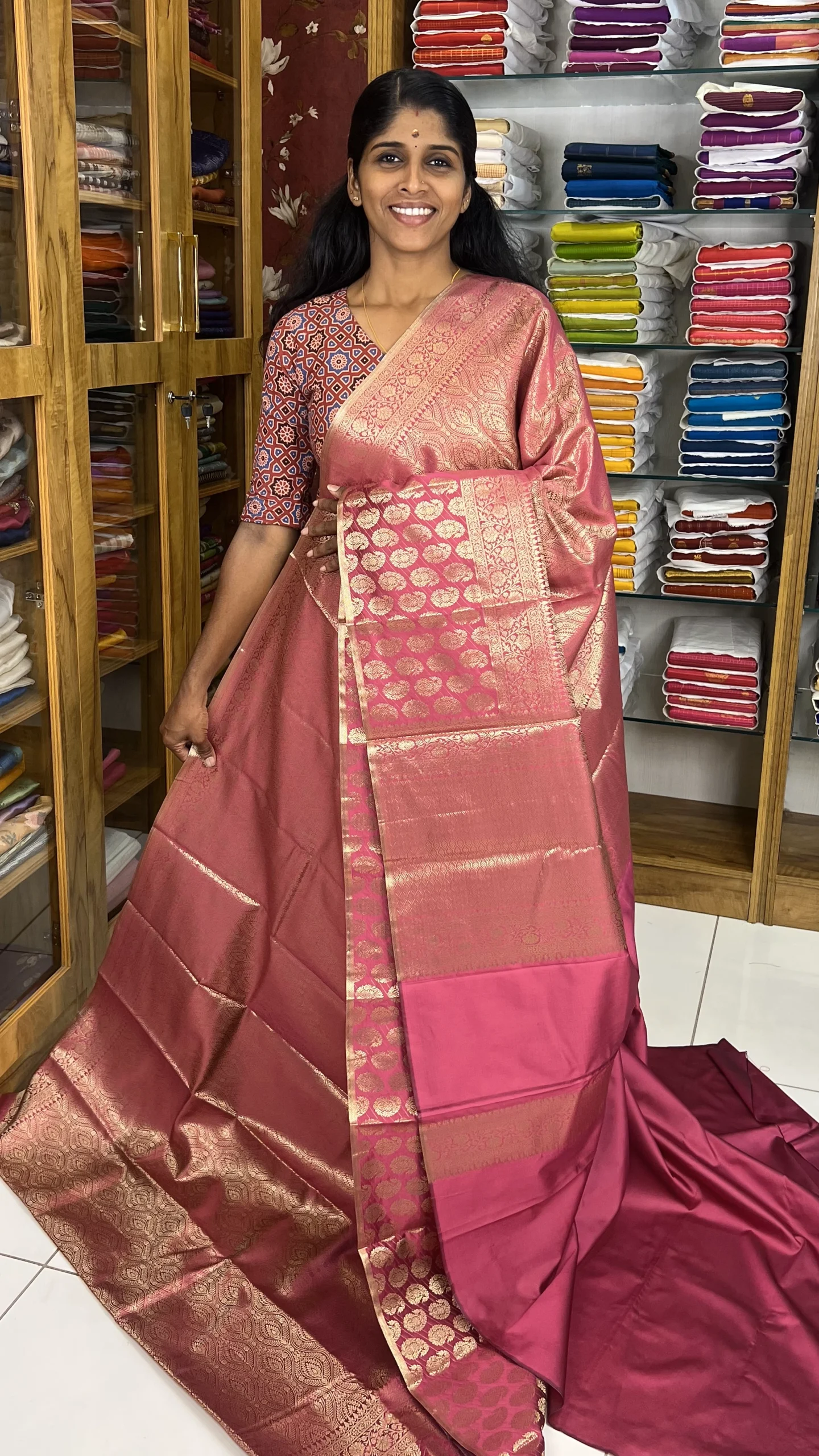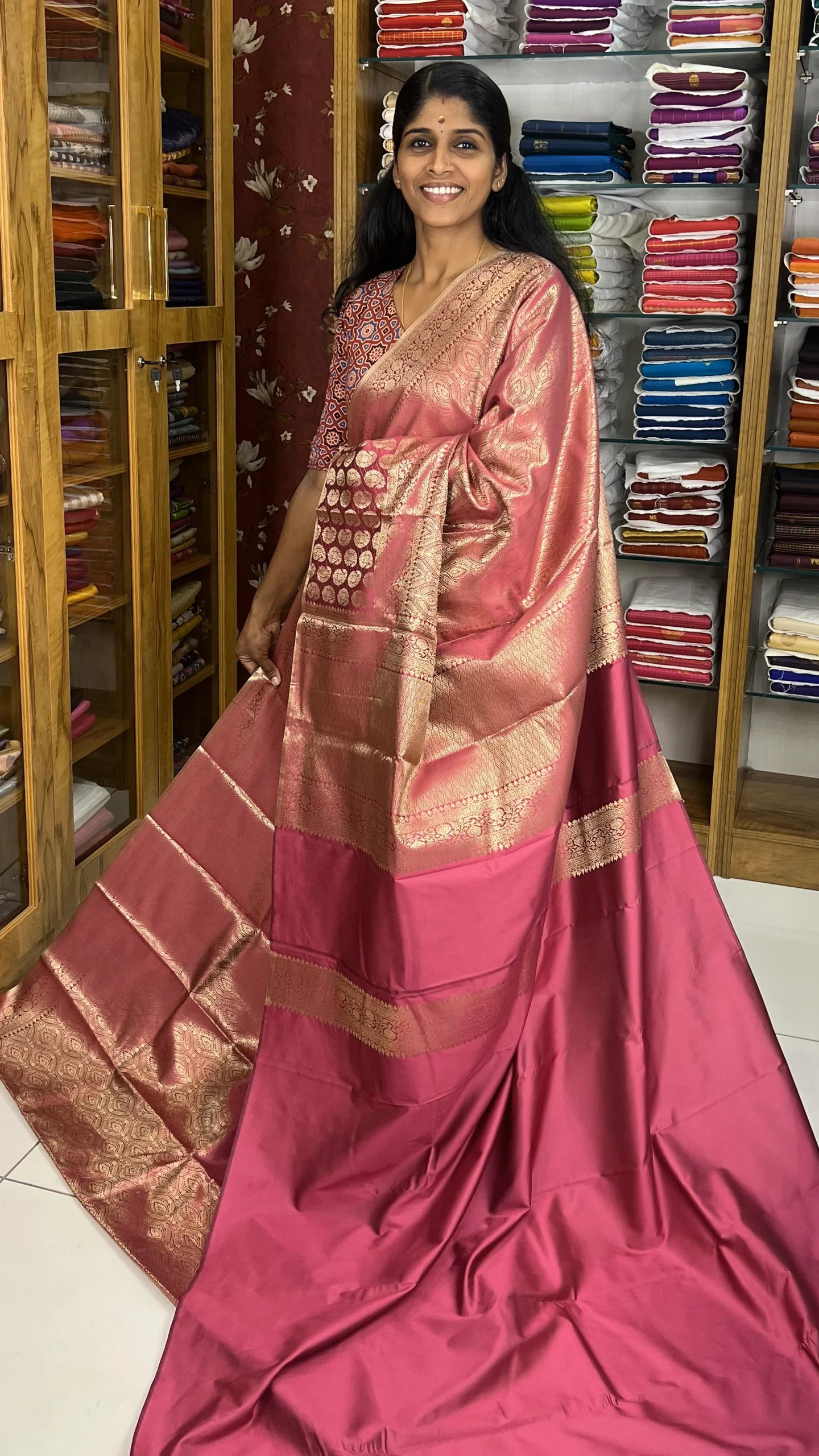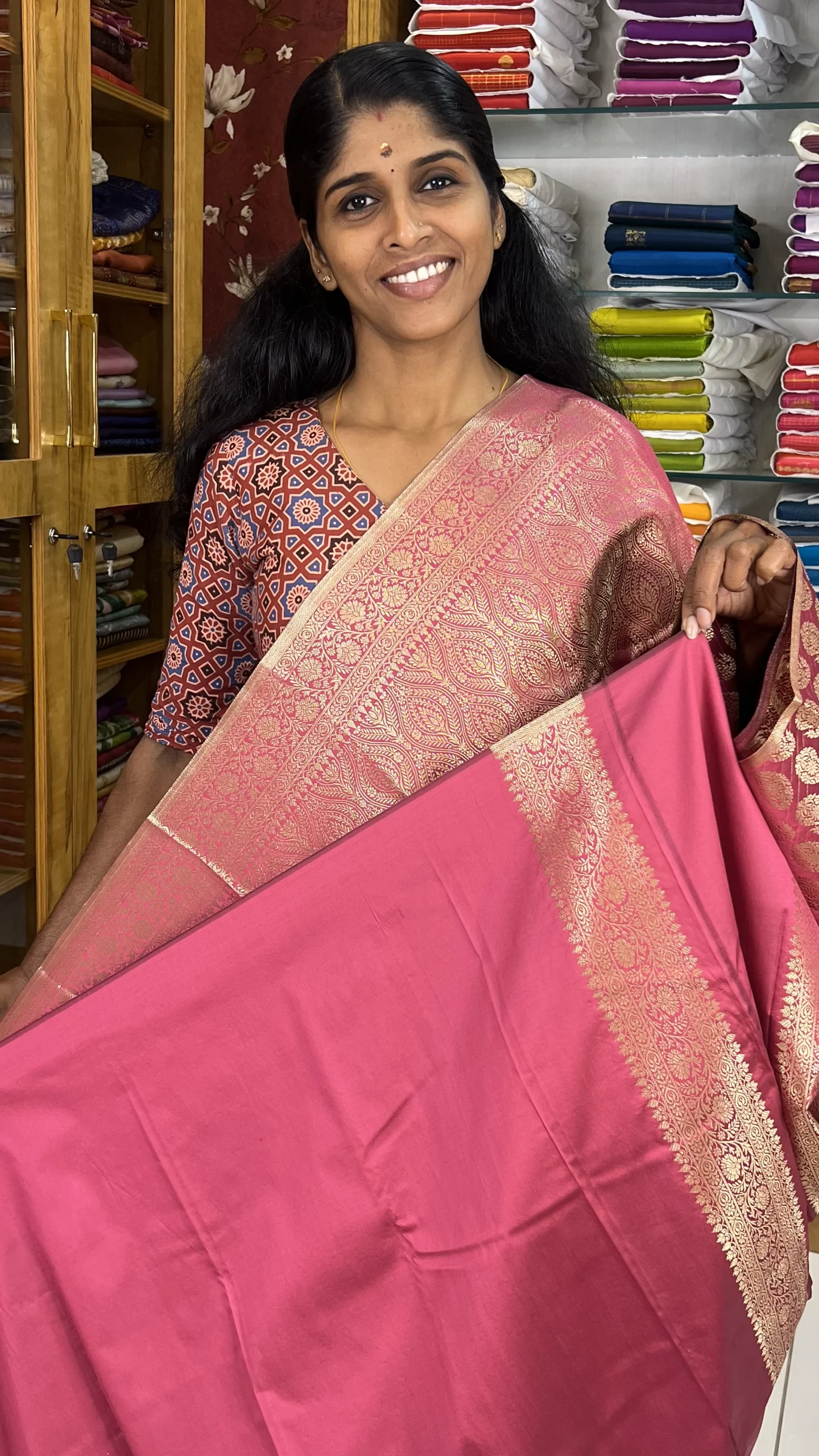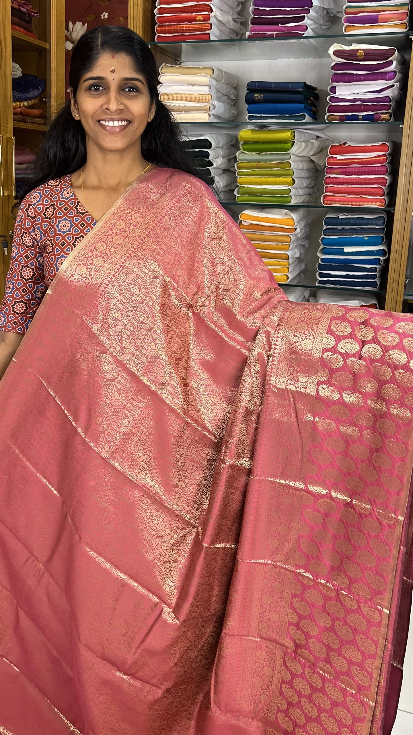 Crafted from smooth and lustrous fabric, this saree drapes effortlessly and offers a graceful silhouette. The Onion Peel shade paired with intricate Zari work gives it a royal and sophisticated finish, making it ideal for weddings, festivals, traditional gatherings, and special events.