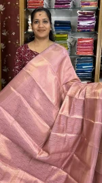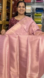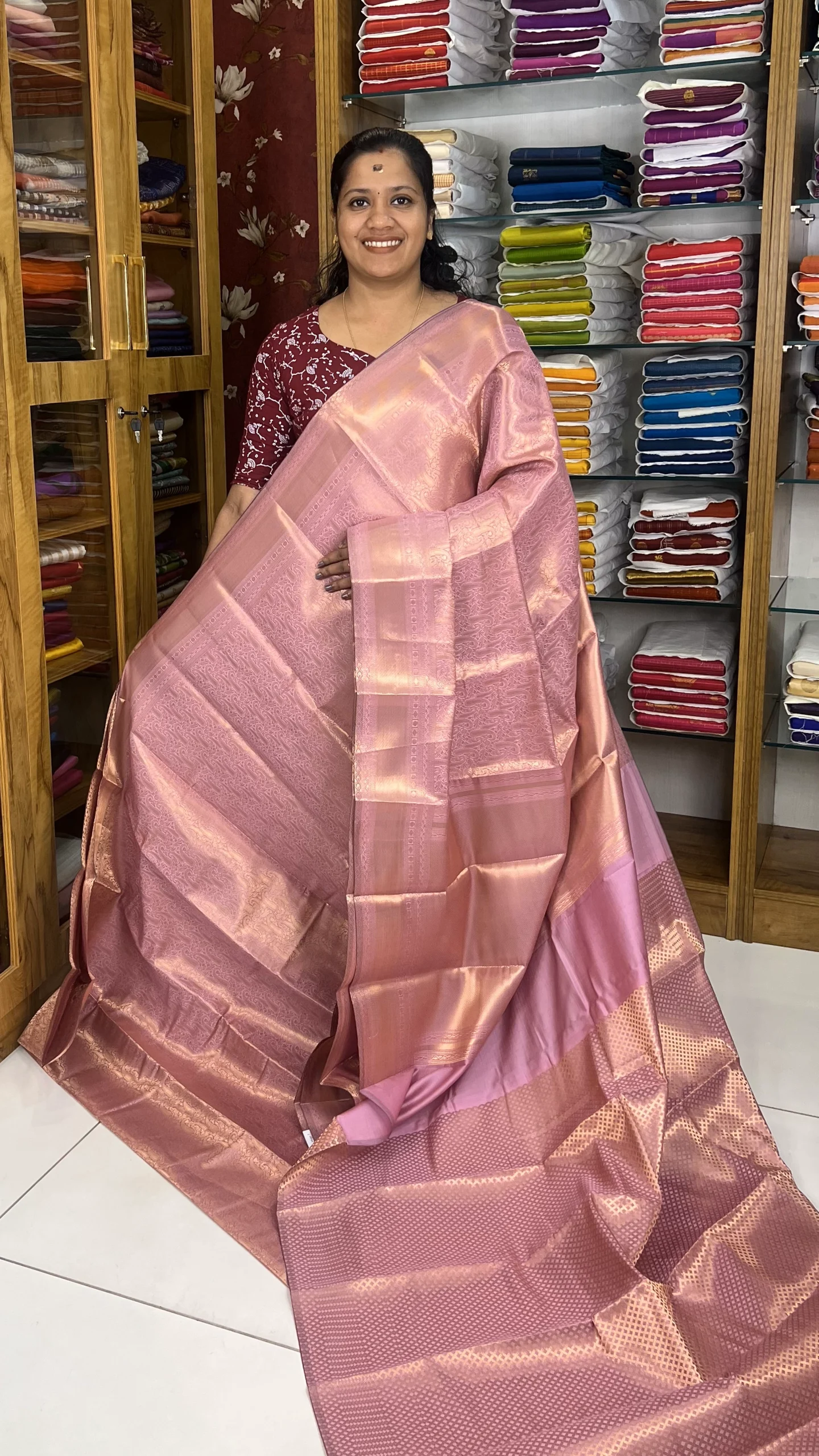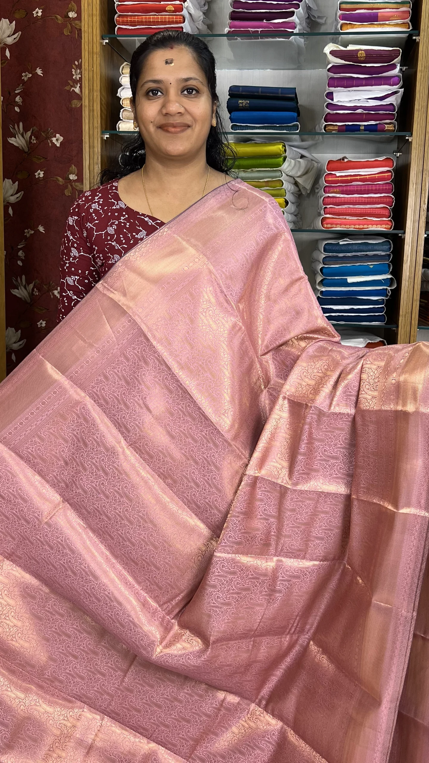 Elegant dusty rose pink silk saree featuring intricate gold Zari weaving, a lustrous finish, and a beautifully detailed pallu—perfect for weddings and festive occasions.