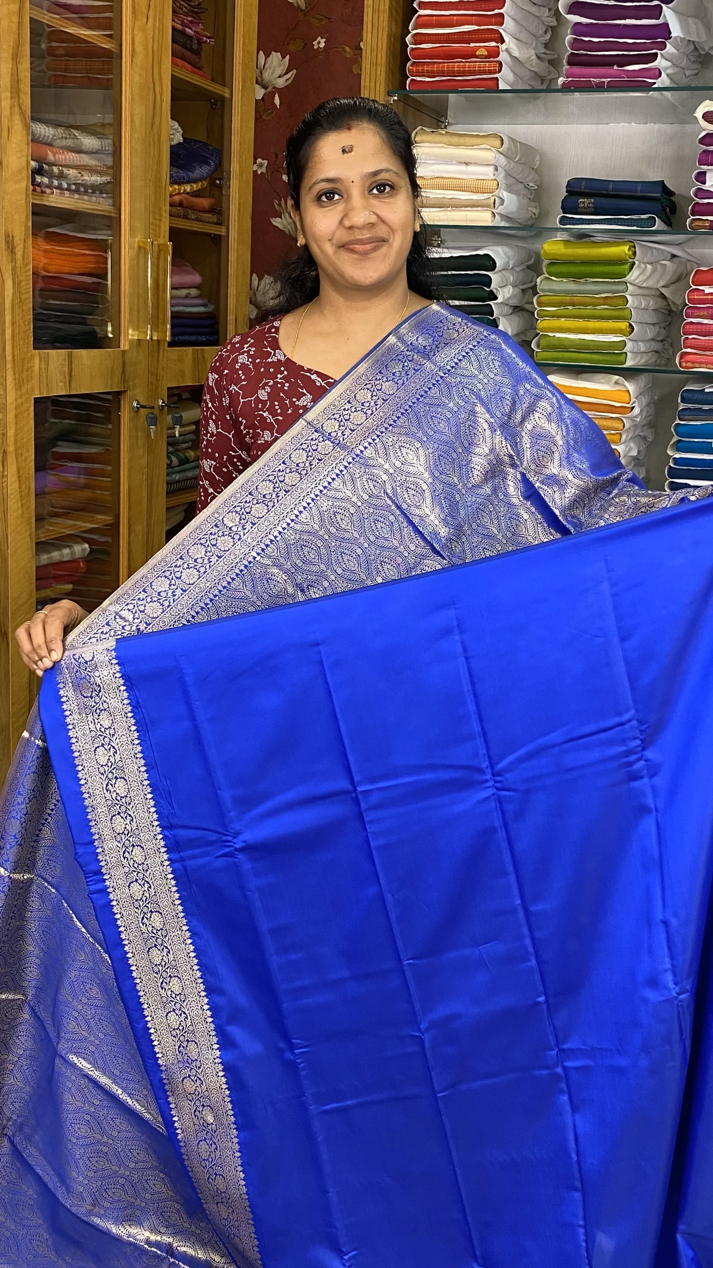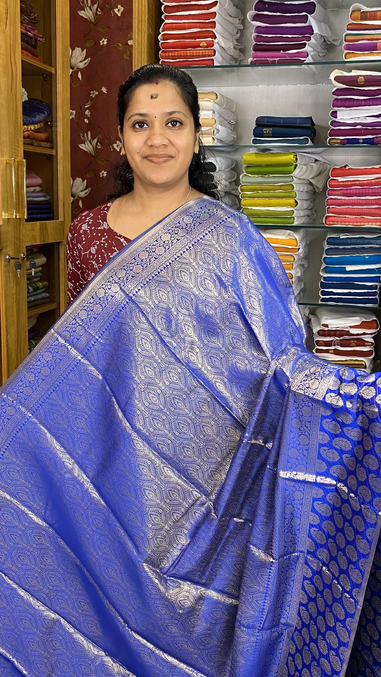 Elegant Royal Blue Semi silk saree with a luxurious sheen, featuring traditional woven motifs and a beautifully designed Zari border and pallu. Perfect for weddings, festive celebrations, and special occasions.
