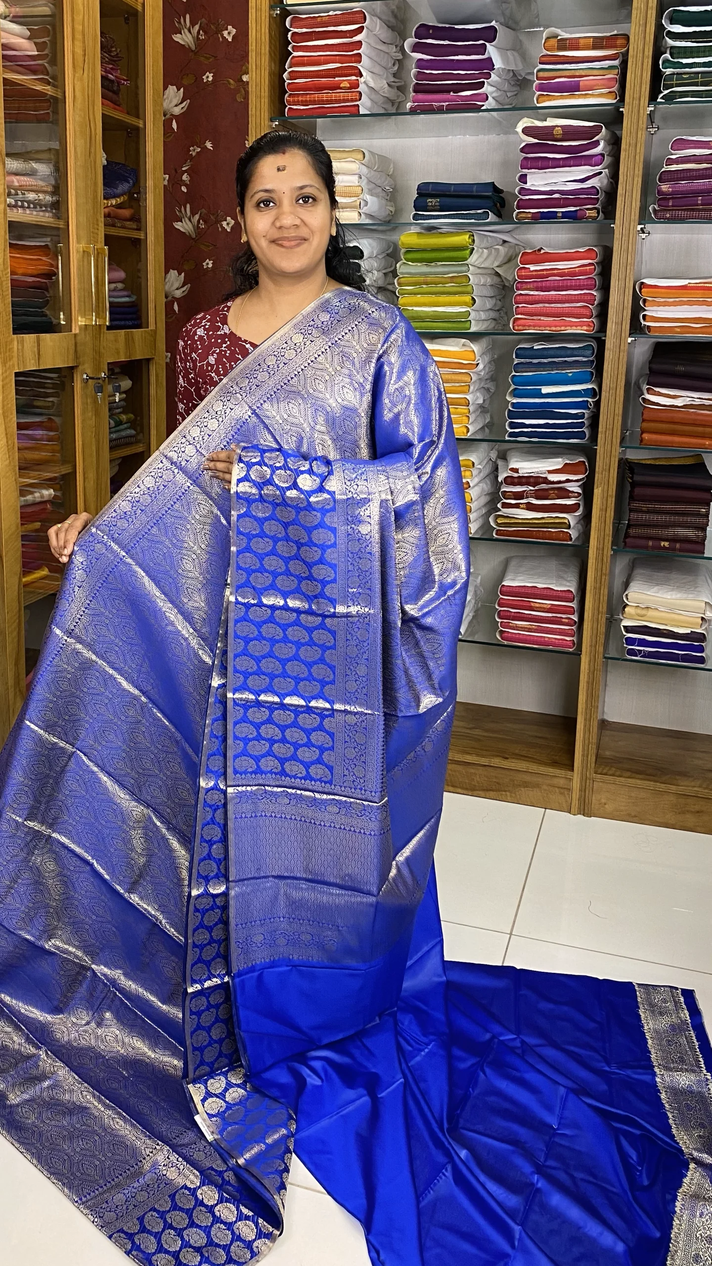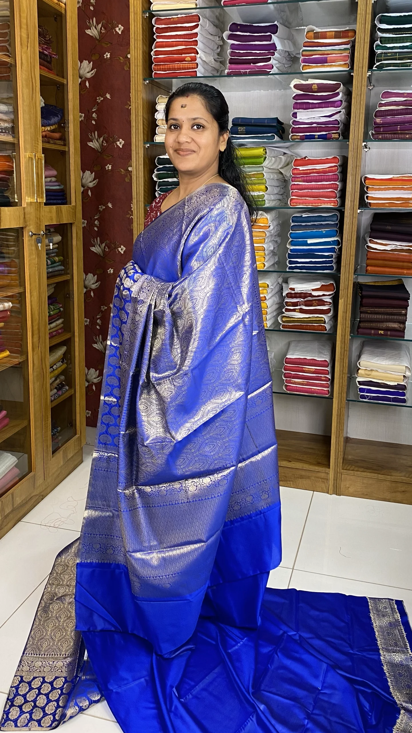 Crafted from smooth and lustrous fabric, this saree drapes effortlessly and offers a graceful silhouette. The Royal Blue shade paired with intricate Zari work gives it a royal and sophisticated finish, making it ideal for weddings, festivals, traditional gatherings, and special events.