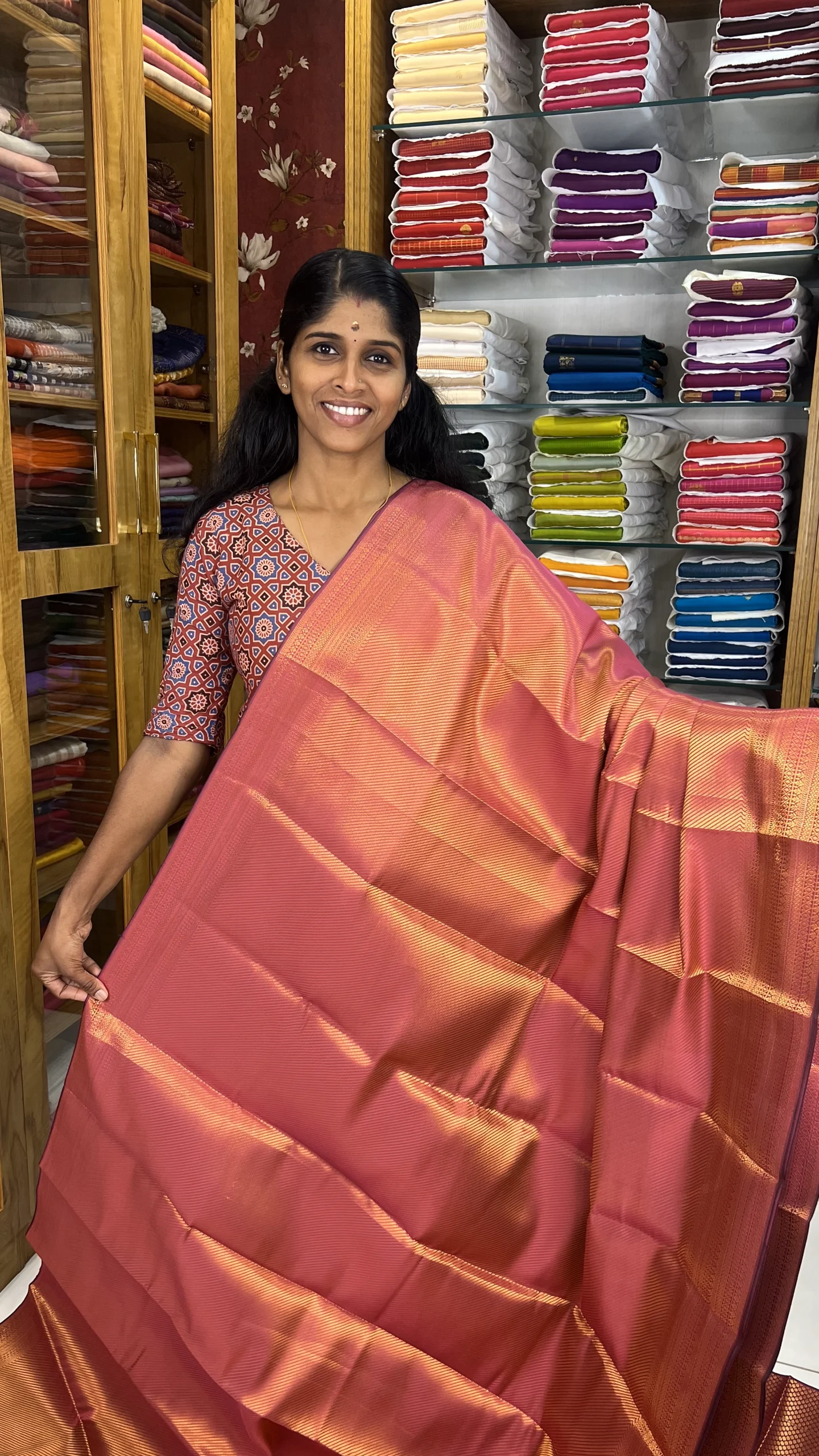 Step into timeless elegance with this exquisite Wine Red silk saree, designed to reflect grace and sophistication. The saree showcases a soft yet beautifully complemented by intricate gold Zari weaving that adds a luxurious sheen throughout the fabric.