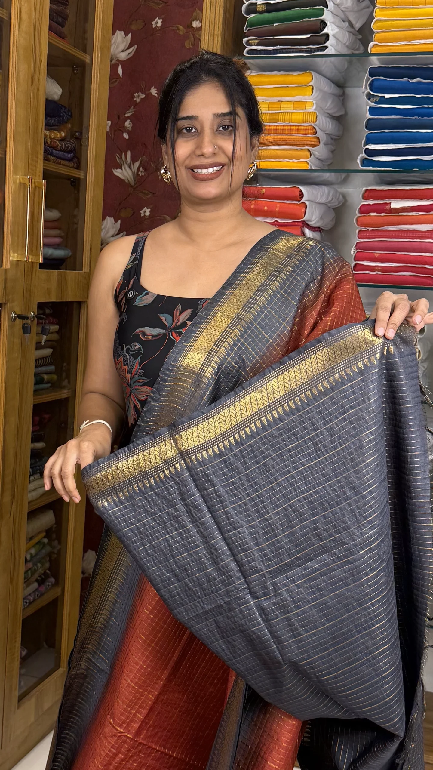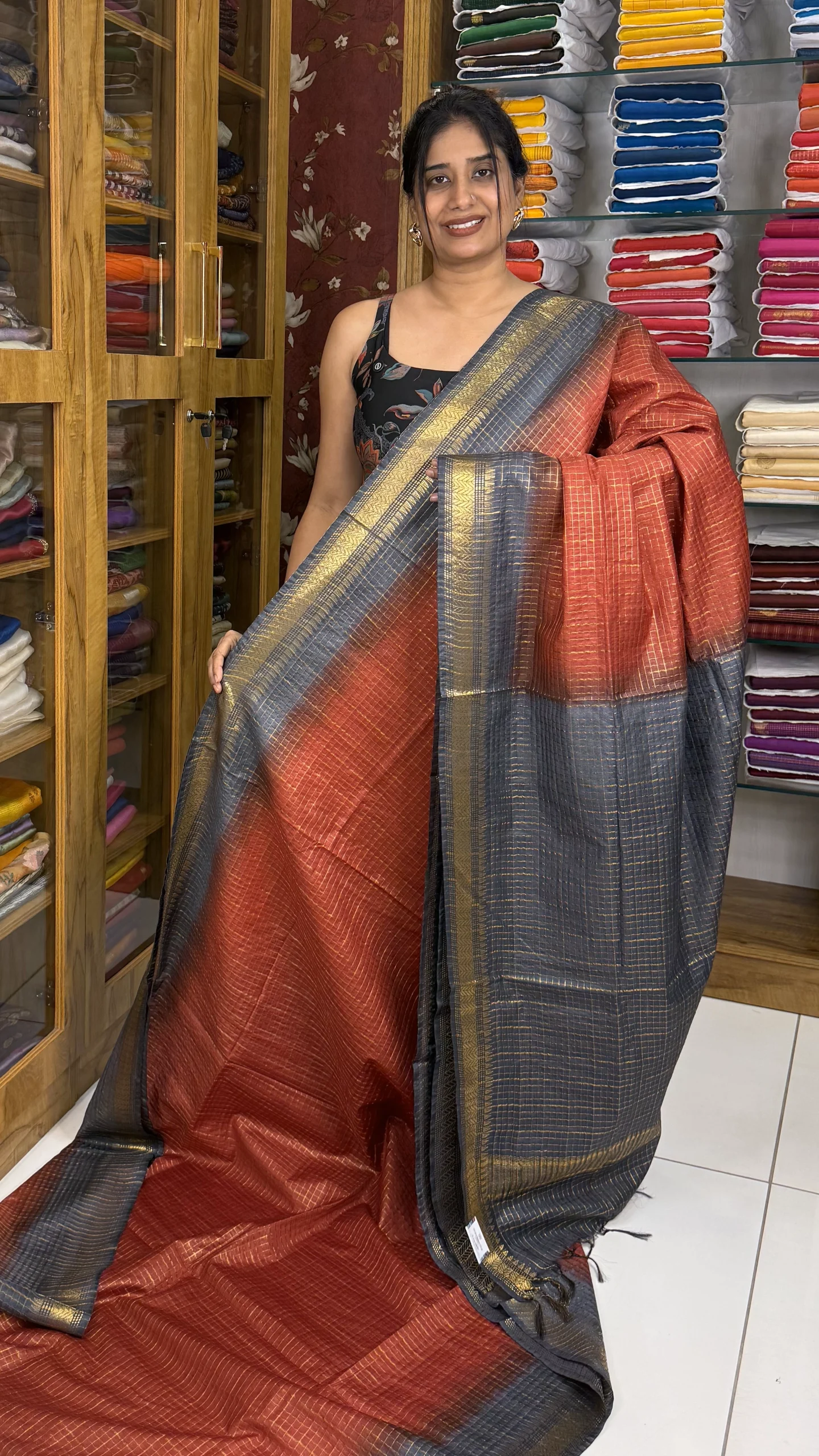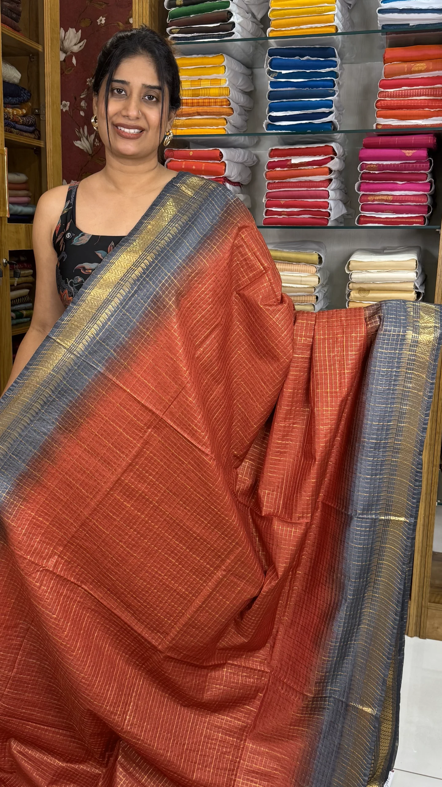 Elegant semi tussar saree featuring rich Zari checks with a stunning combination of Brick Red and Grey. Perfect for festive and traditional occasions.