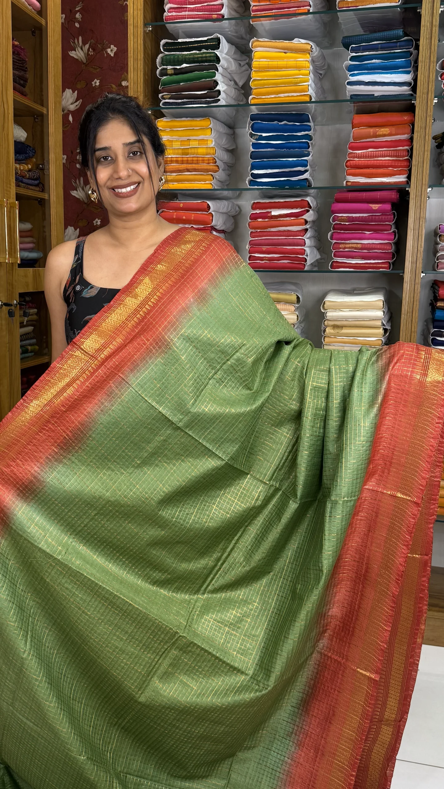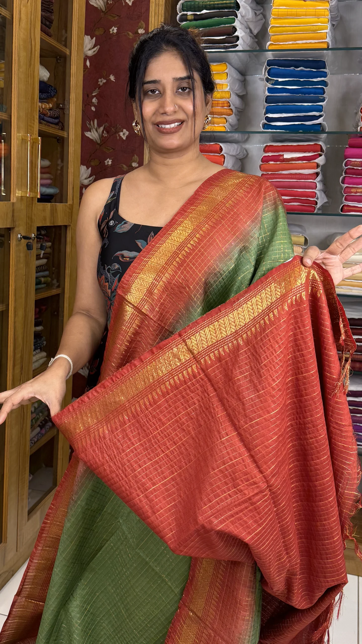 Elegant semi tussar saree featuring rich Zari checks with a stunning combination of Green and Red. Perfect for festive and traditional occasions.