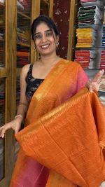 The rich Pink body blends seamlessly with a striking Orange pallu and border, creating a captivating dual-tone effect that stands out effortlessly. The lightweight semi tussar fabric ensures comfort while maintaining a luxurious drape, making it ideal for long hours of wear during festive celebrations, weddings, or cultural gatherings.