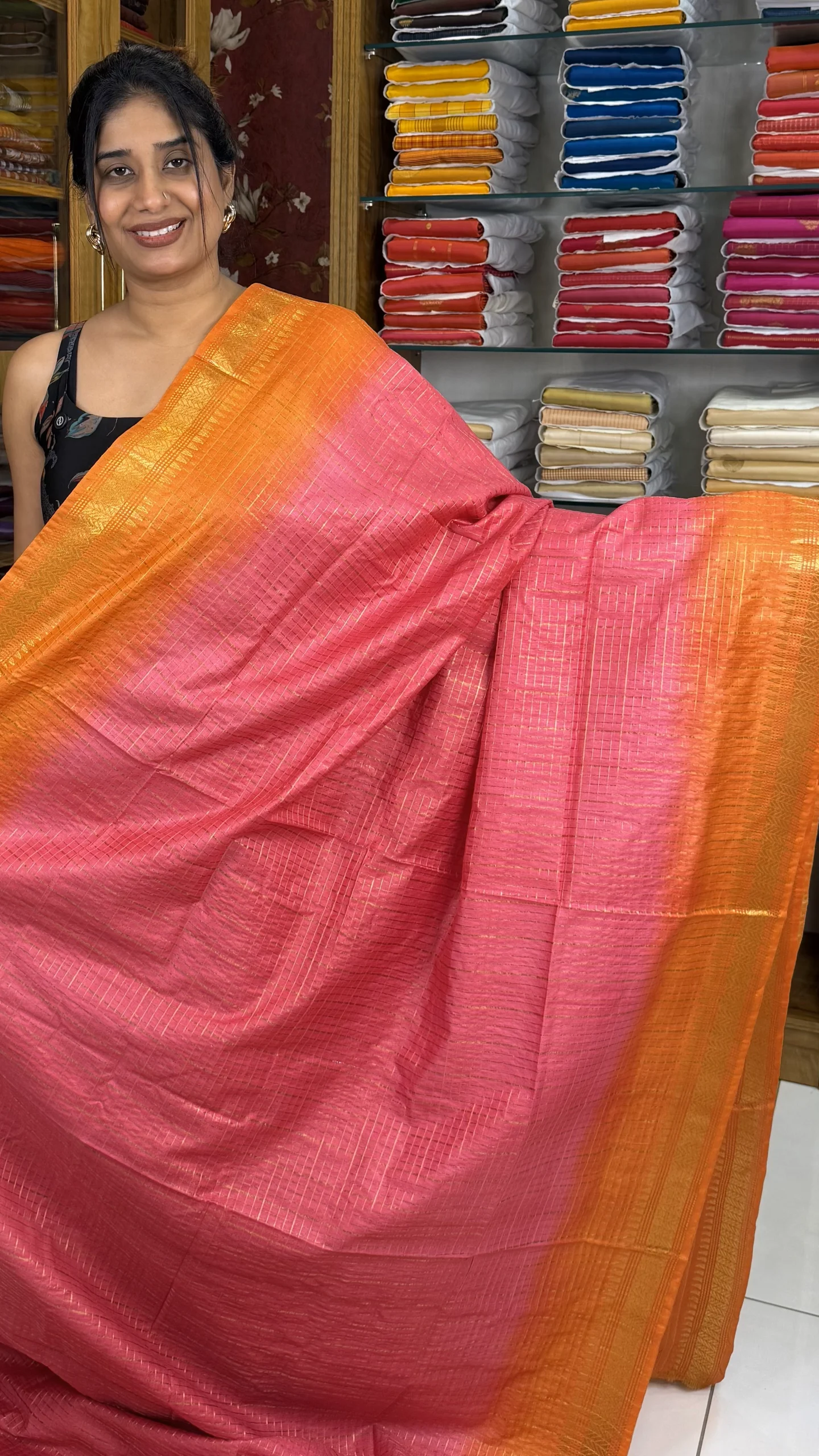 Elegant semi tussar saree featuring rich Zari checks with a stunning combination of Pink and Orange. Perfect for festive and traditional occasions.