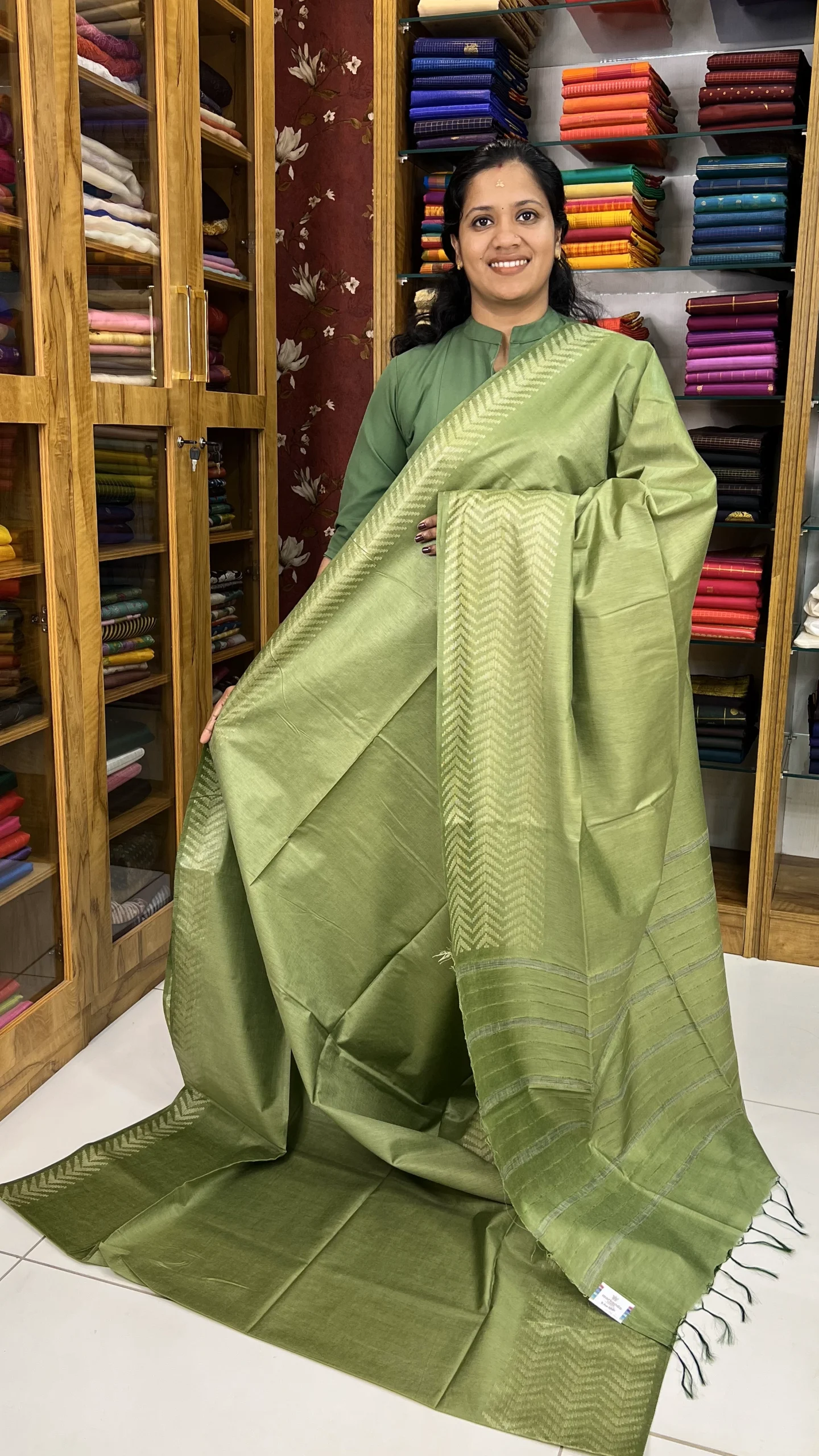Pair it with a matching Algae Green blouse for a timeless look or an off-cream blouse to highlight the woven border detailing.