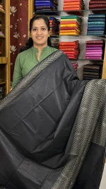 The rich black body is beautifully accentuated by intricately woven off-white and self-thread detailing along the borders in a refined zigzag pattern. The coordinated pallu features subtle striped weaving with elegant tassel finishes, adding depth and character to the overall design.