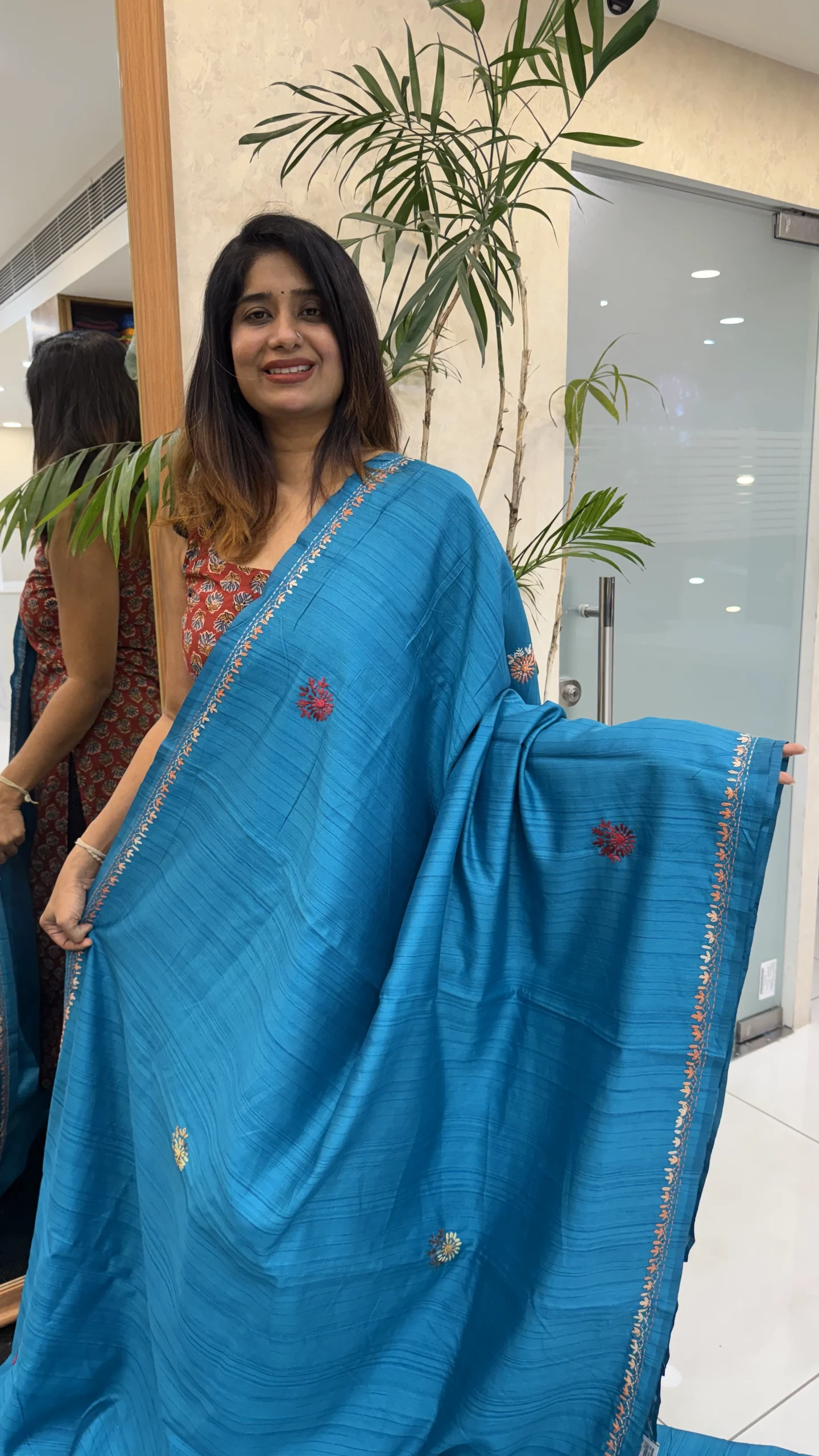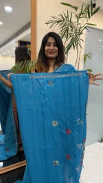The soothing blue shade adds elegance and versatility, making it suitable for festive celebrations, cultural gatherings, and special occasions. The detailed hand embroidery enhances the overall charm, while the semi Tussar fabric ensures a graceful drape and comfortable wear throughout the day.