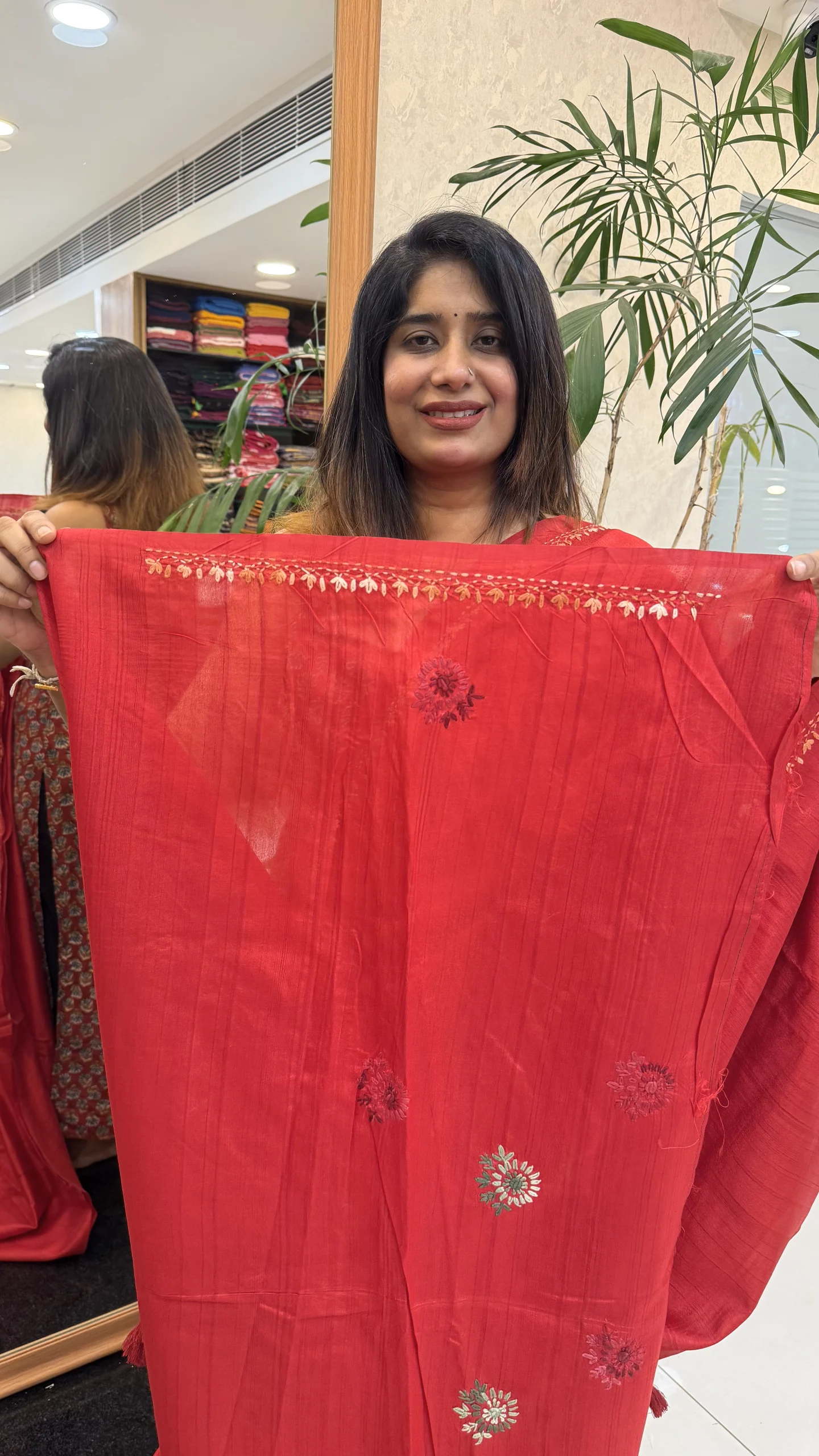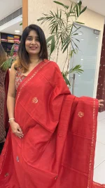 The soothing red shade adds elegance and versatility, making it suitable for festive celebrations, cultural gatherings, and special occasions. The detailed hand embroidery enhances the overall charm, while the semi Tussar fabric ensures a graceful drape and comfortable wear throughout the day.