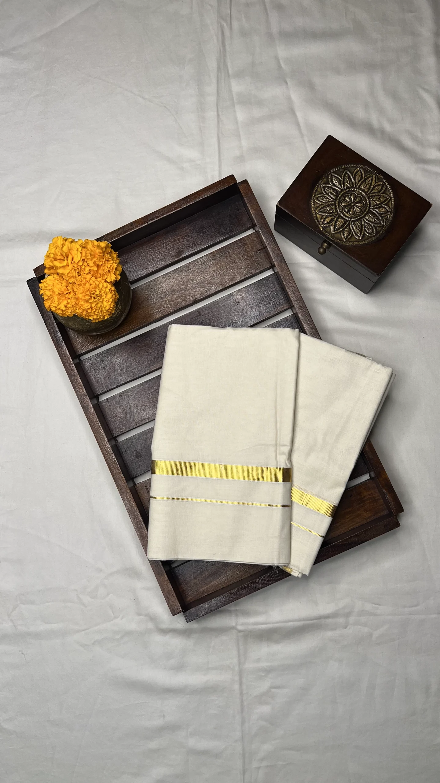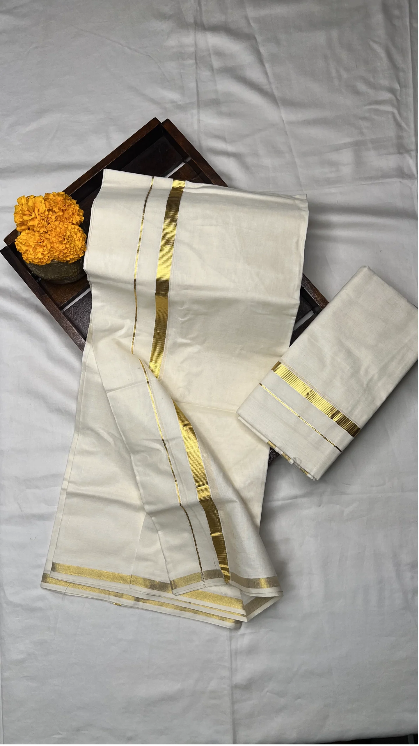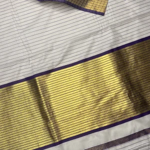Embrace the beauty of Kerala tradition with this elegant Transitional Set Mundu crafted in a classic off-white tone. The set features a minimal yet graceful small gold zari border, adding a touch of traditional charm and sophistication.