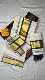 Traditional set mundu featuring elegant gold stripes across the body, complemented by a striking violet and gold border with a hint of green finish.(No blouse piece attached)