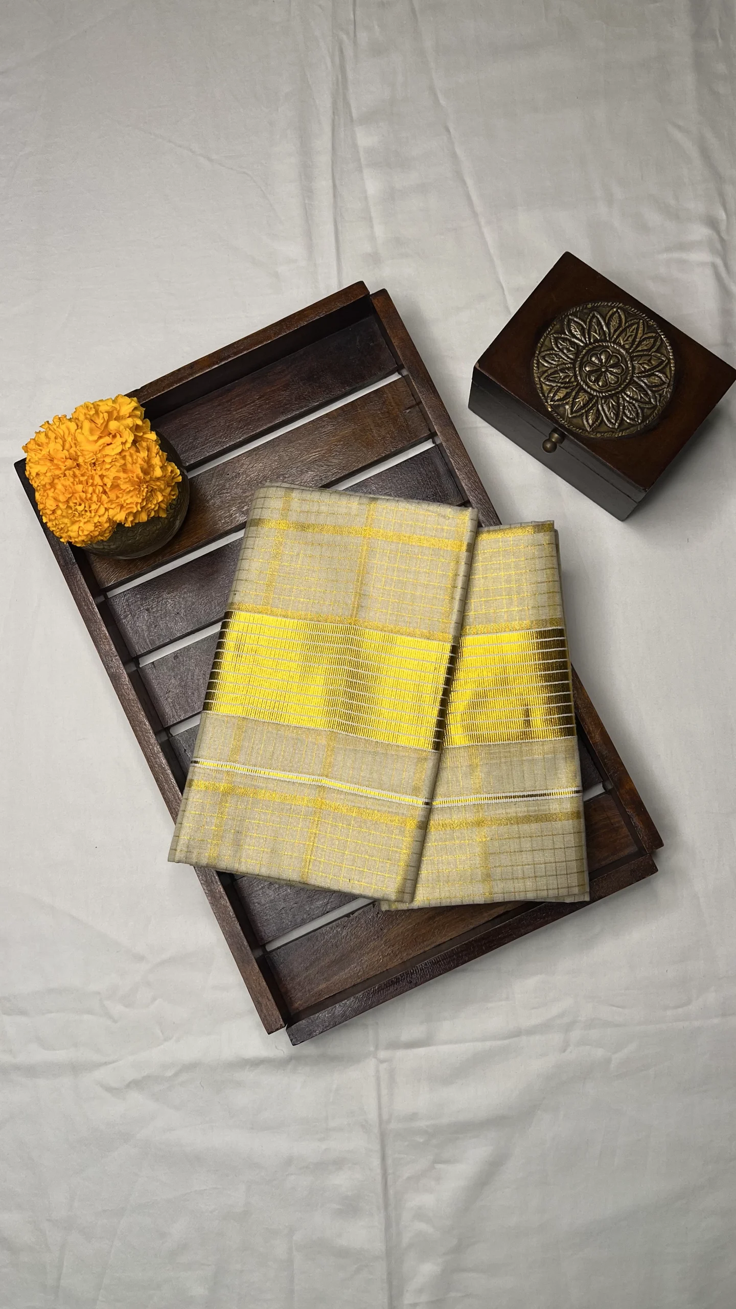 Step into timeless elegance with this beautifully designed tissue set mundu, crafted to showcase classic Kerala tradition with a luxurious touch. The entire mundu is adorned with a stunning gold zari check pattern, creating a radiant and sophisticated appearance.