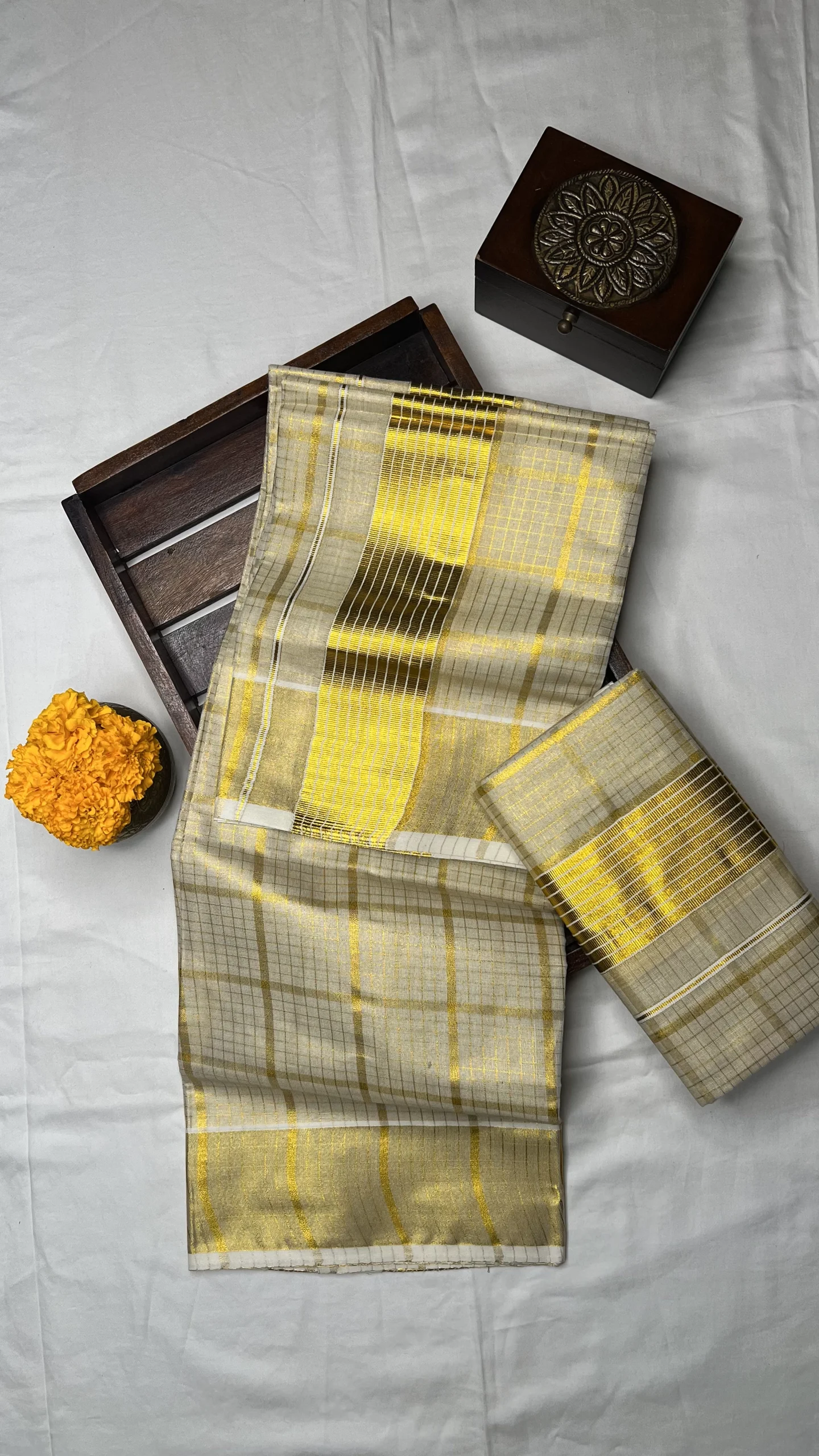 Elegant tissue set mundu featuring a rich gold zari check pattern with bold box-style design, perfect for a grand traditional look (No blouse piece attached)