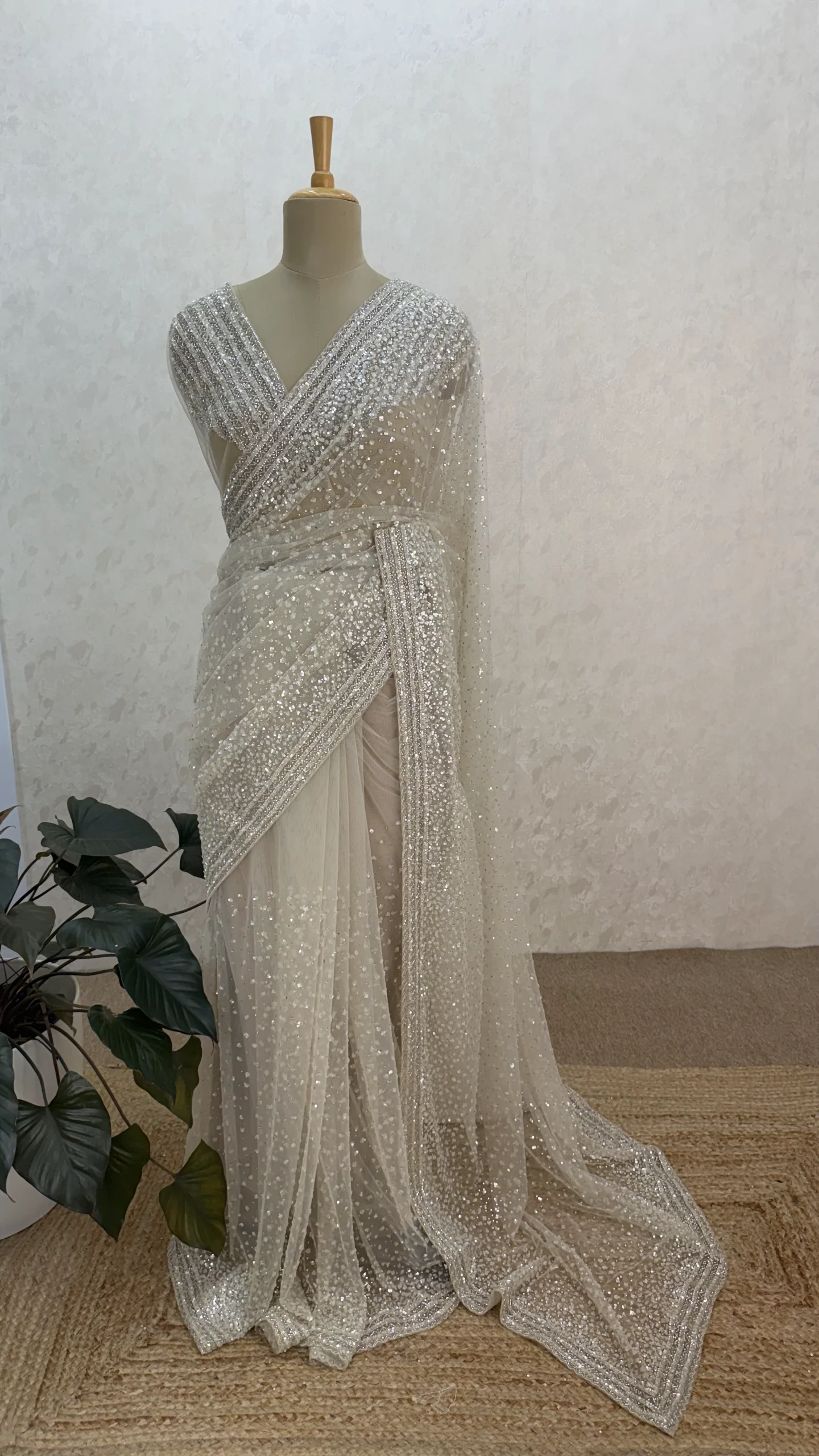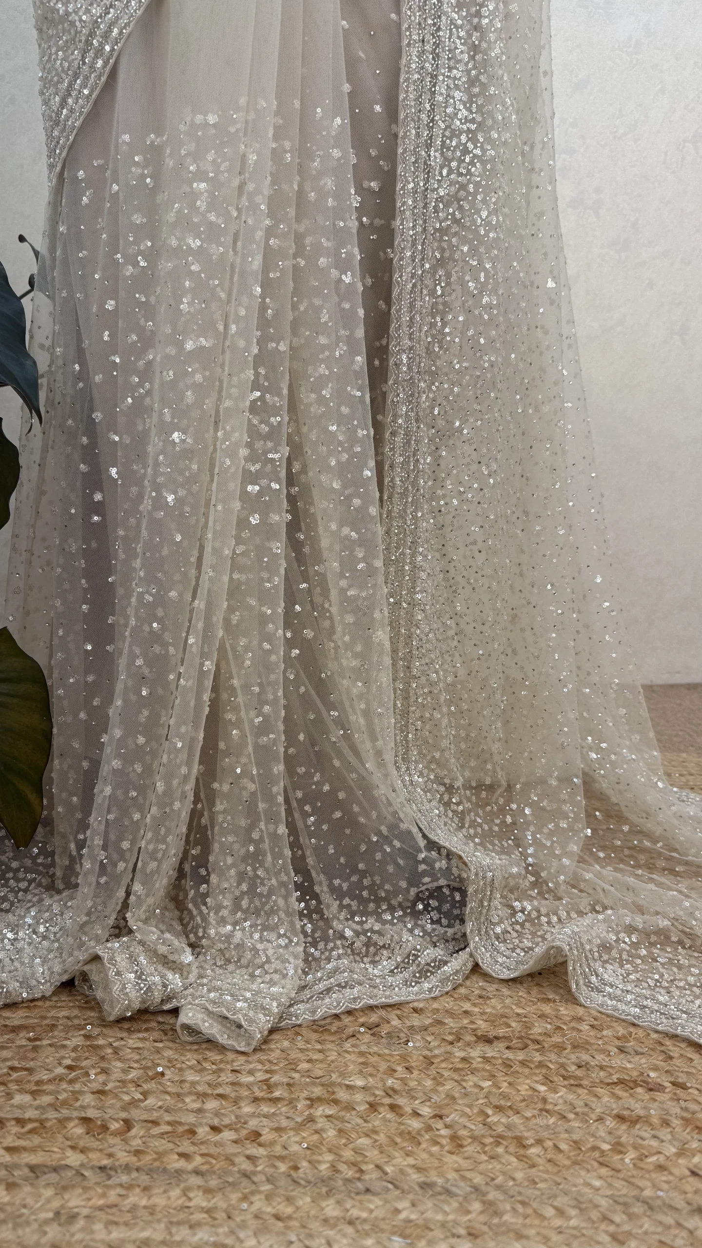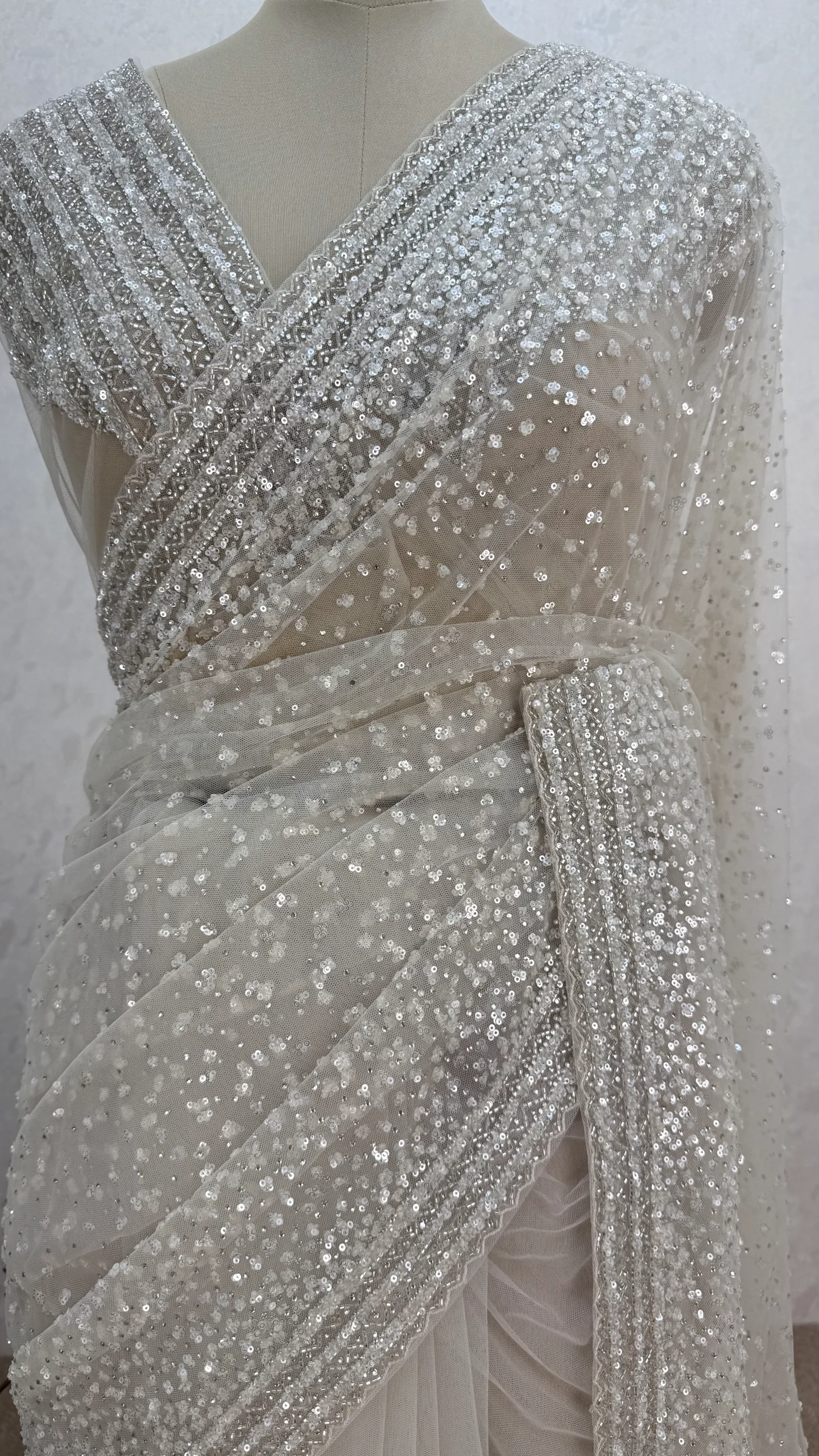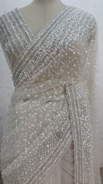 The saree is highlighted with fine all-over sequin work and intricately embellished borders, creating a soft shimmer that catches the light beautifully without being overpowering. The neutral tone enhances its versatility, making it an ideal choice for weddings, receptions, cocktail parties, and festive celebrations.