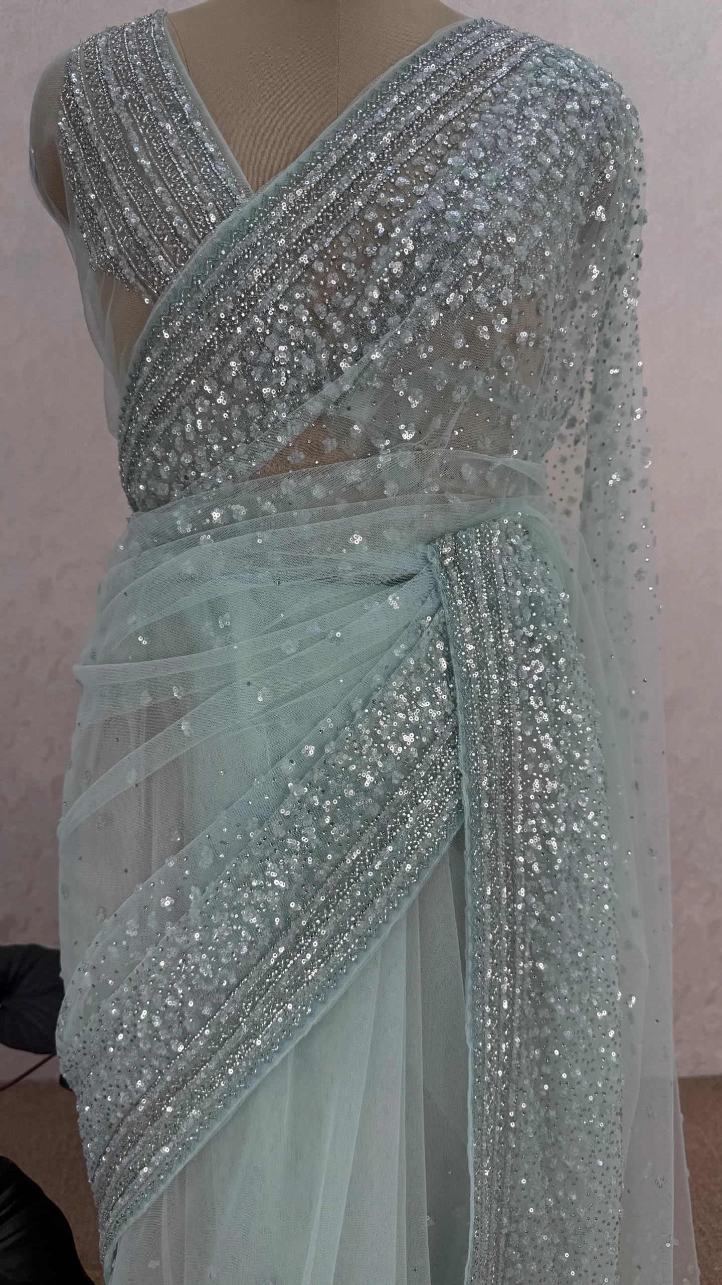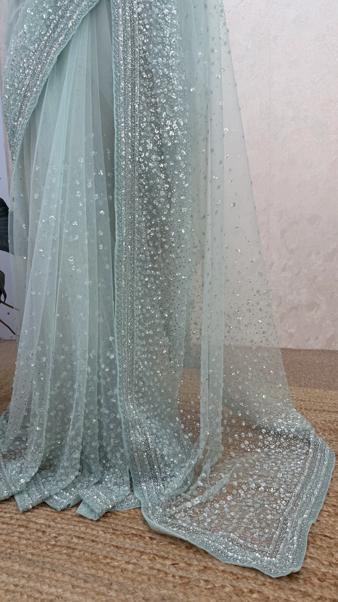 Elegant soft net saree in a mint green shade, beautifully adorned with intricate handwork and shimmering sequin detailing. Ideal for weddings, parties, and evening occasions.