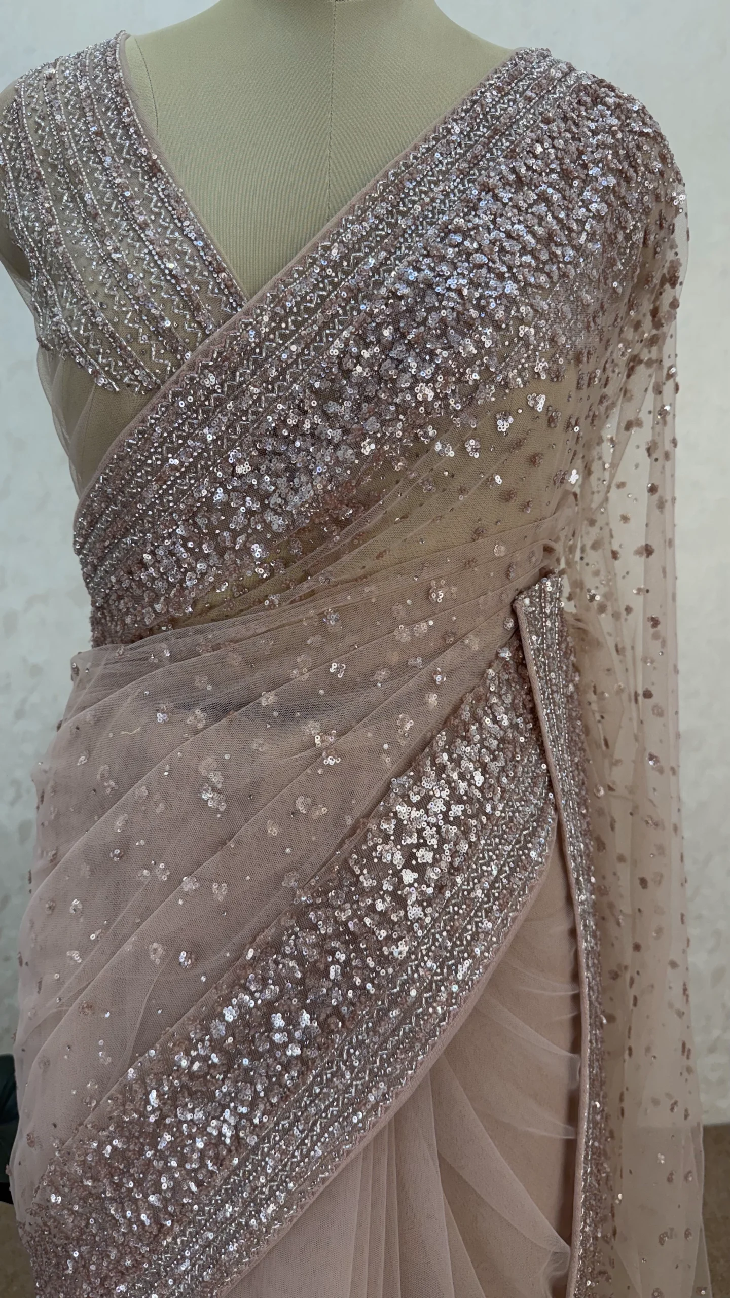 The saree is exquisitely embellished with intricate handwork and all-over sequin detailing, adding a subtle sparkle that enhances its sophisticated appeal. The delicately worked pallu and borders elevate the overall look, making it perfect for weddings, receptions, cocktail parties, and festive evenings.