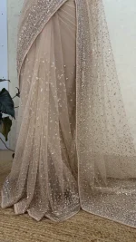 Elegant soft net saree in a rich mocha shade, beautifully adorned with intricate handwork and shimmering sequin detailing. Ideal for weddings, parties, and evening occasions.