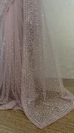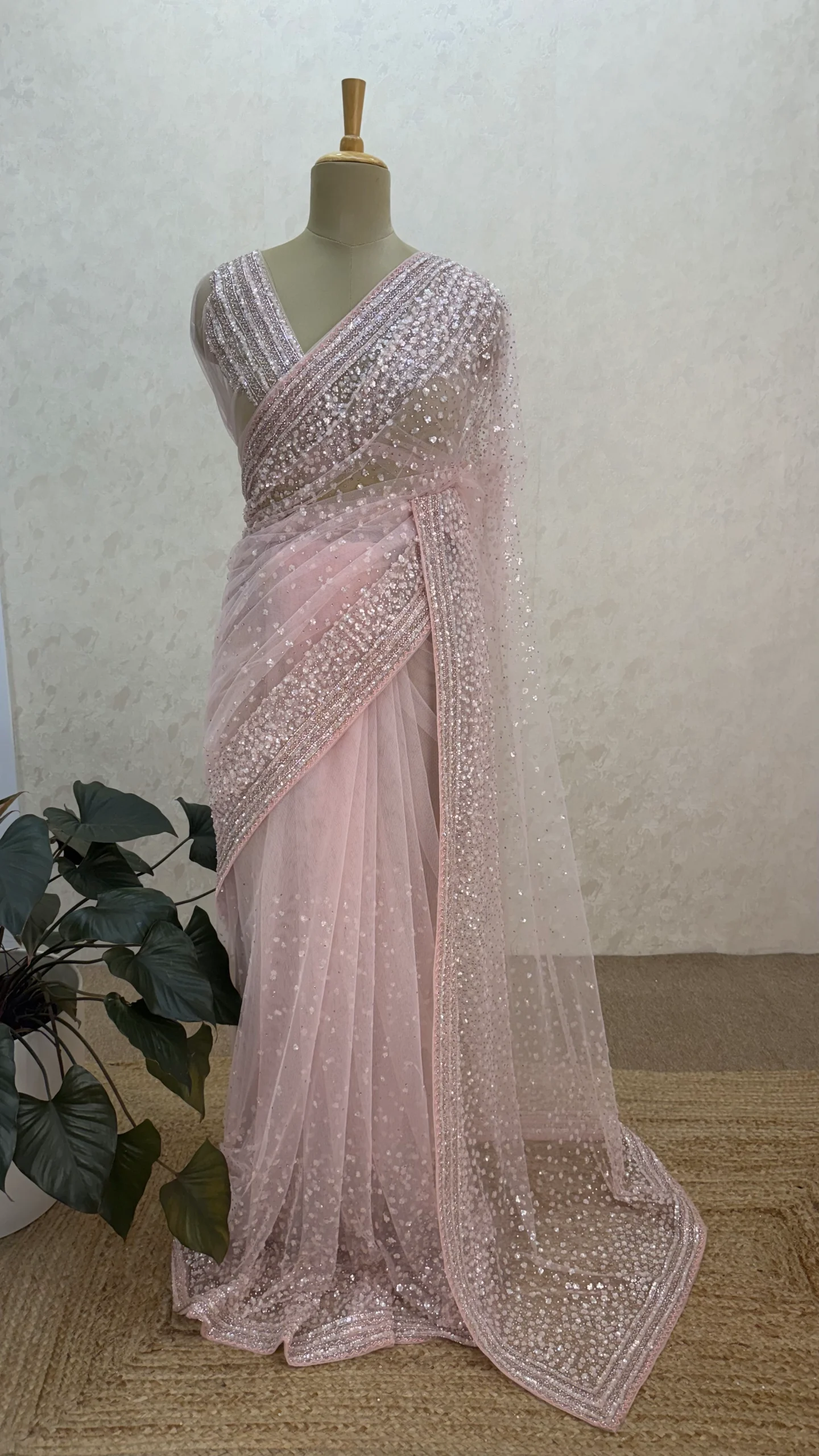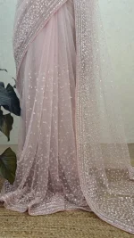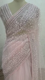 Elegant soft net saree in a pink shade, beautifully adorned with intricate handwork and shimmering sequin detailing. Ideal for weddings, parties, and evening occasions.