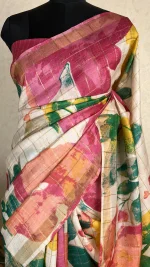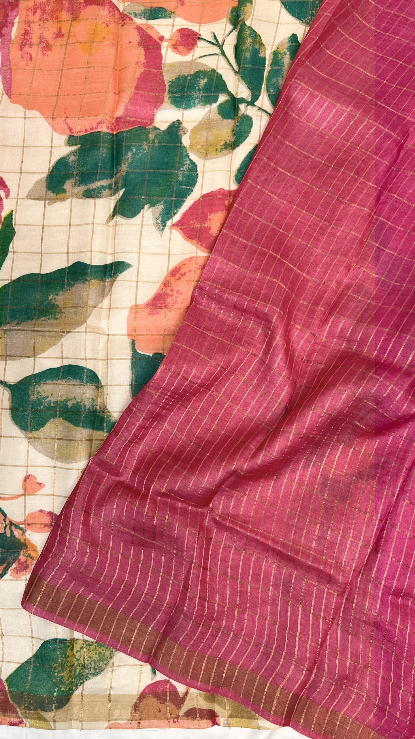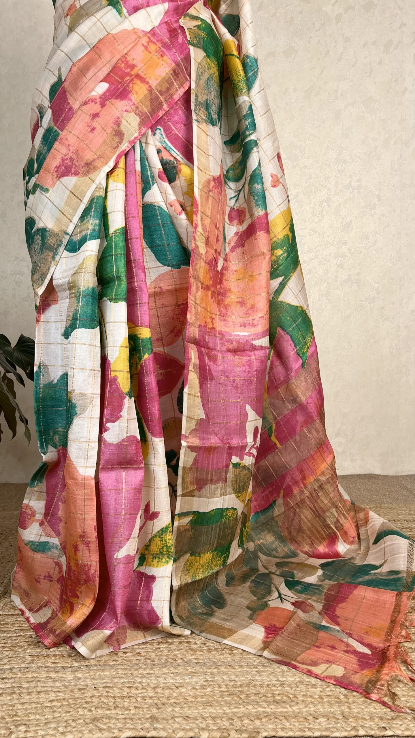 Off-white check saree featuring bold floral prints, blending classic patterns with a modern, elegant appeal.