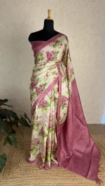 Embrace timeless elegance with this off-white tussar silk saree, beautifully enhanced with soft pink floral prints. Crafted from premium tussar silk, the saree features a rich natural texture and a lightweight drape that ensures comfort throughout the day.