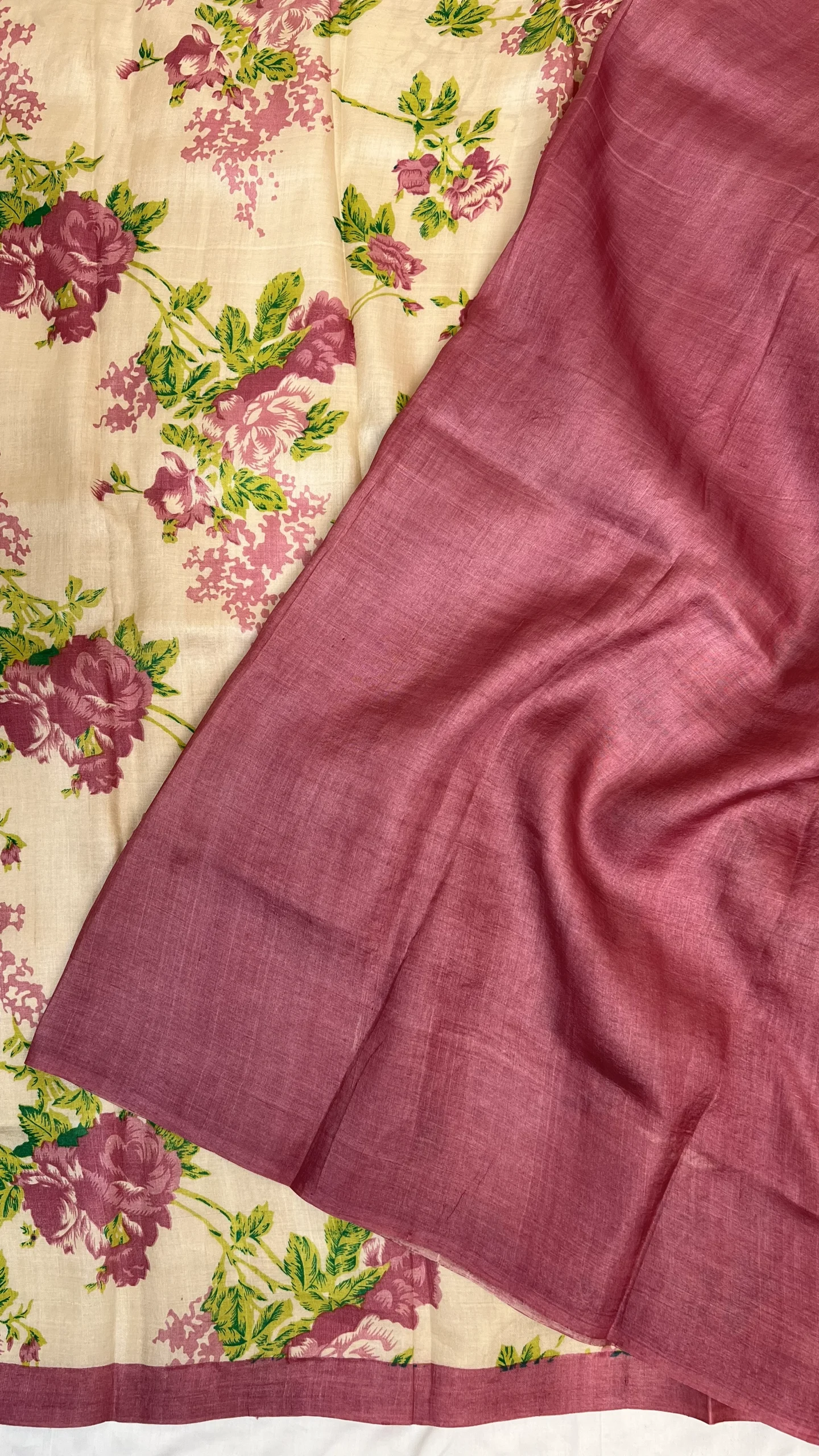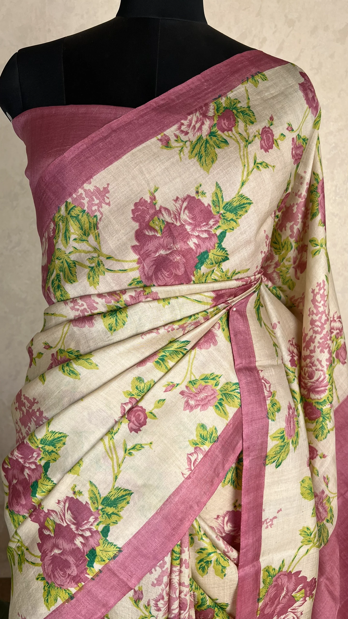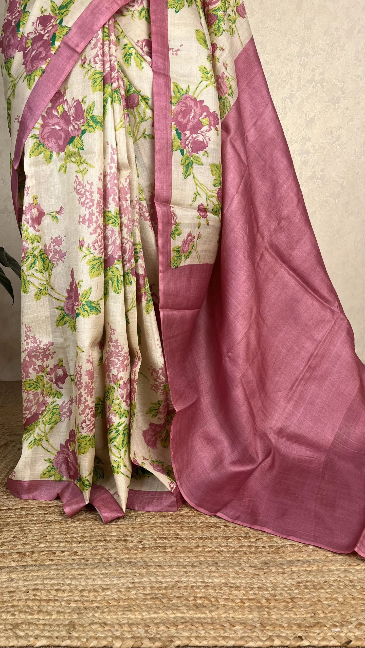 Elegant off-white tussar silk saree adorned with delicate pink floral prints, offering a perfect blend of natural texture and graceful charm.