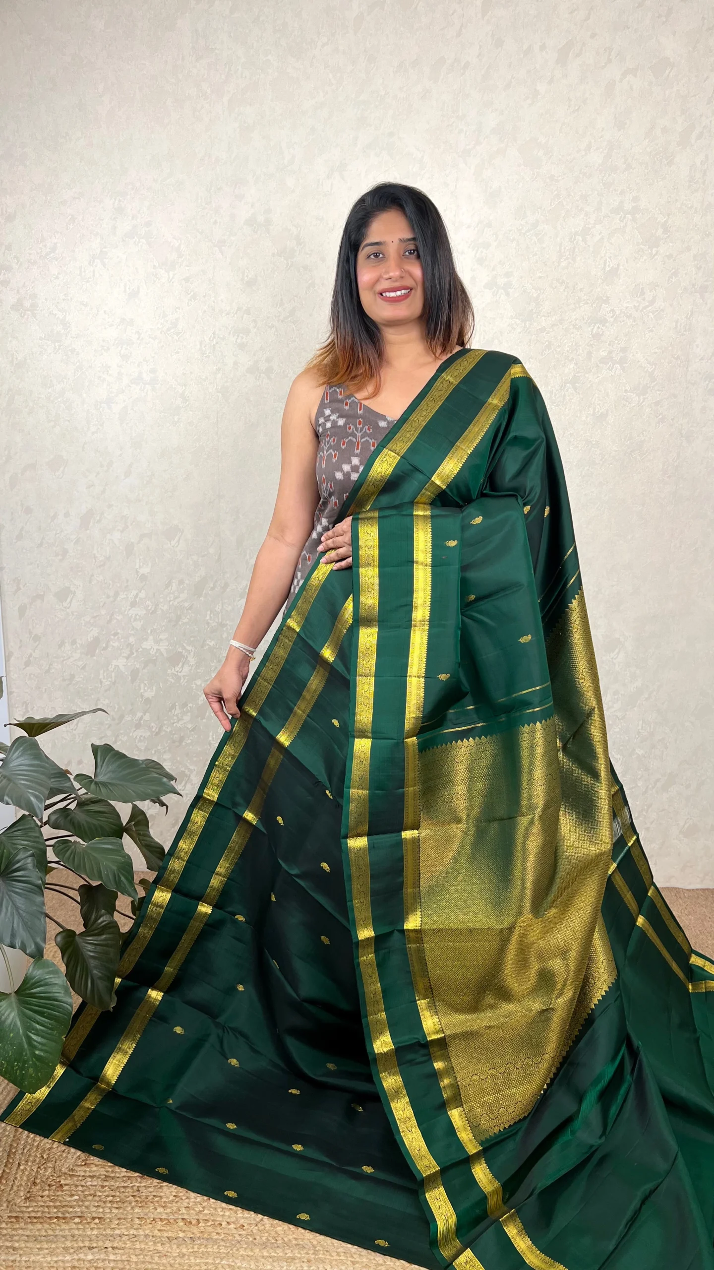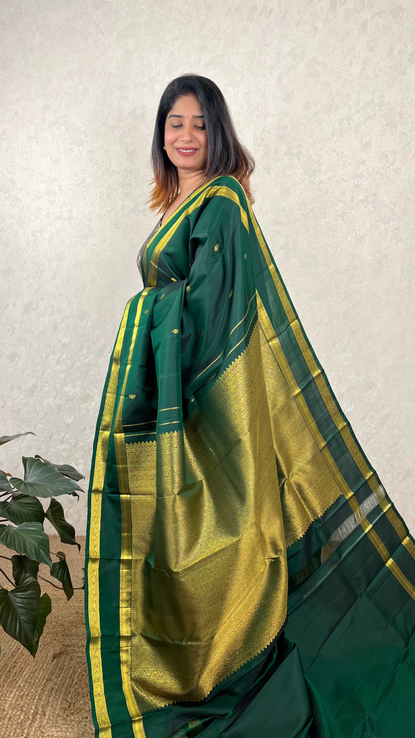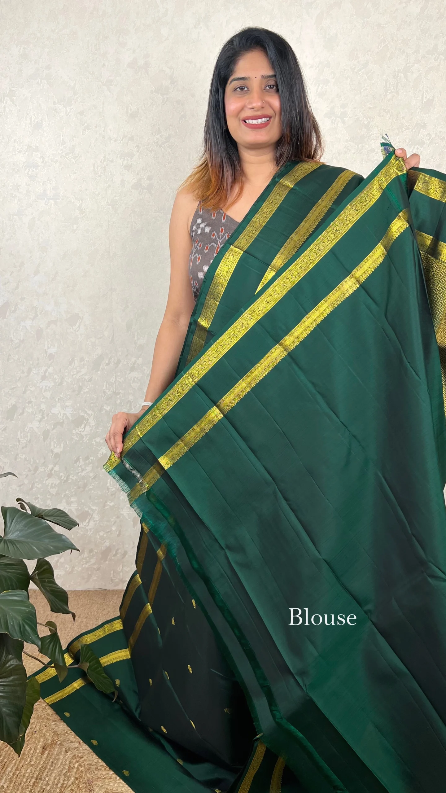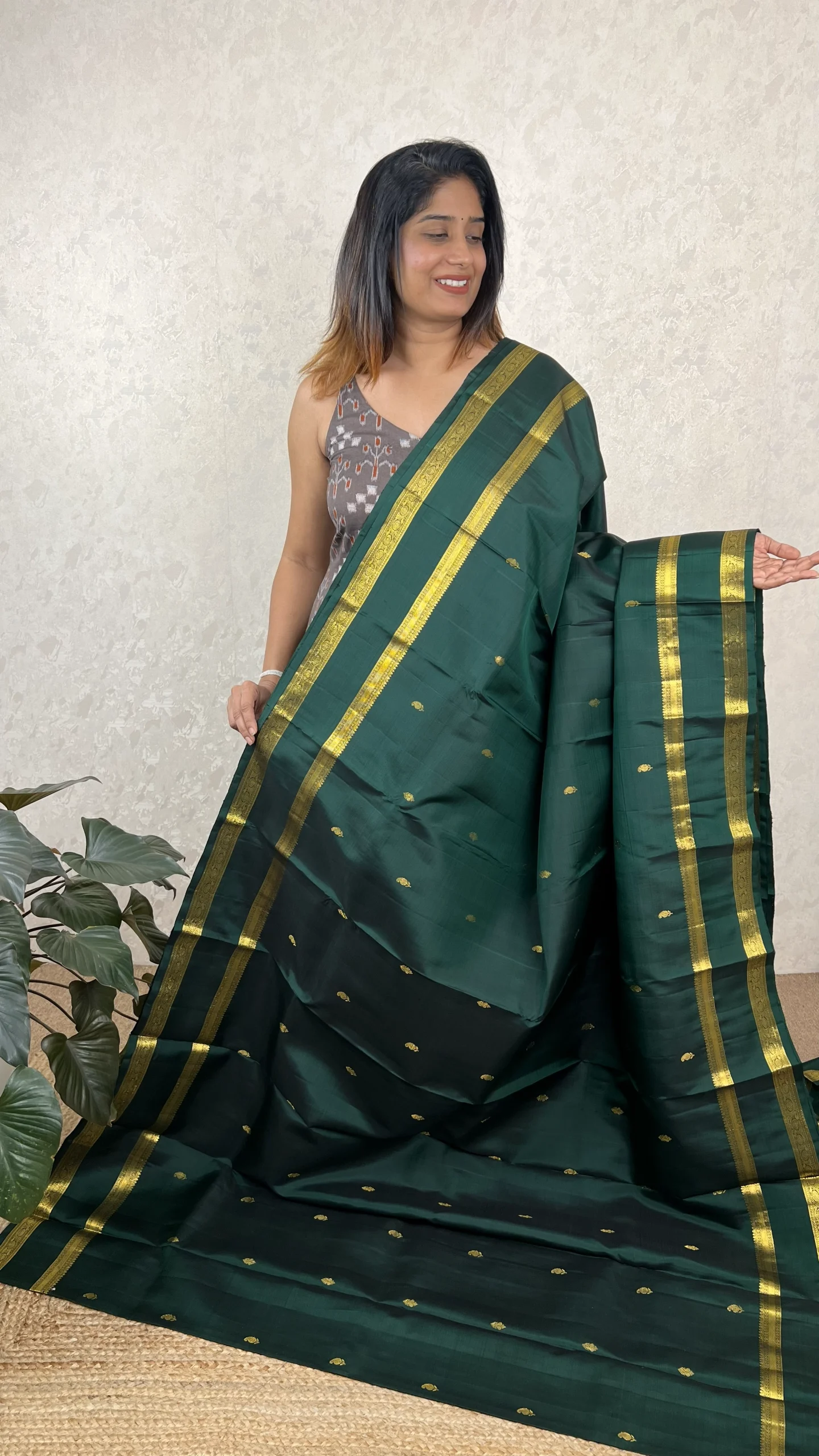 Experience timeless elegance with this Bottle Green Kanchipuram Silk Saree, crafted to reflect the rich heritage of South Indian weaving. The deep bottle green silk body is adorned with graceful Zari paisley buttas, adding a subtle yet regal charm to the saree.