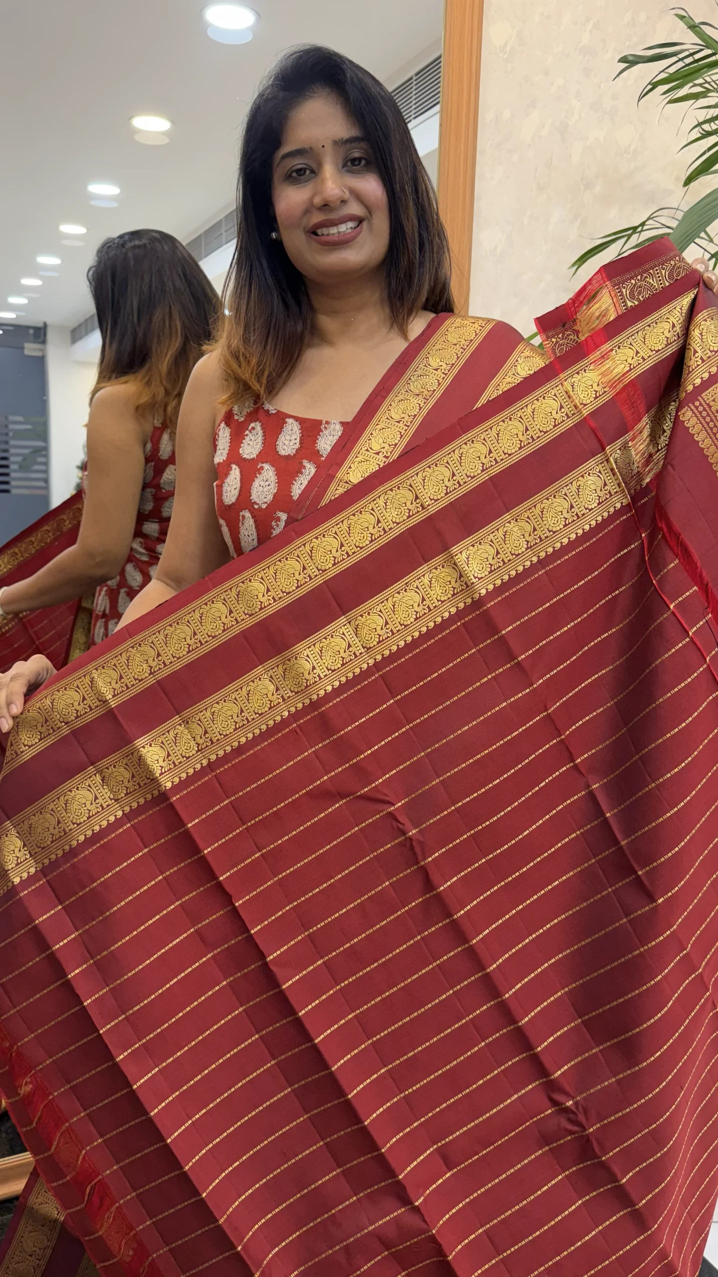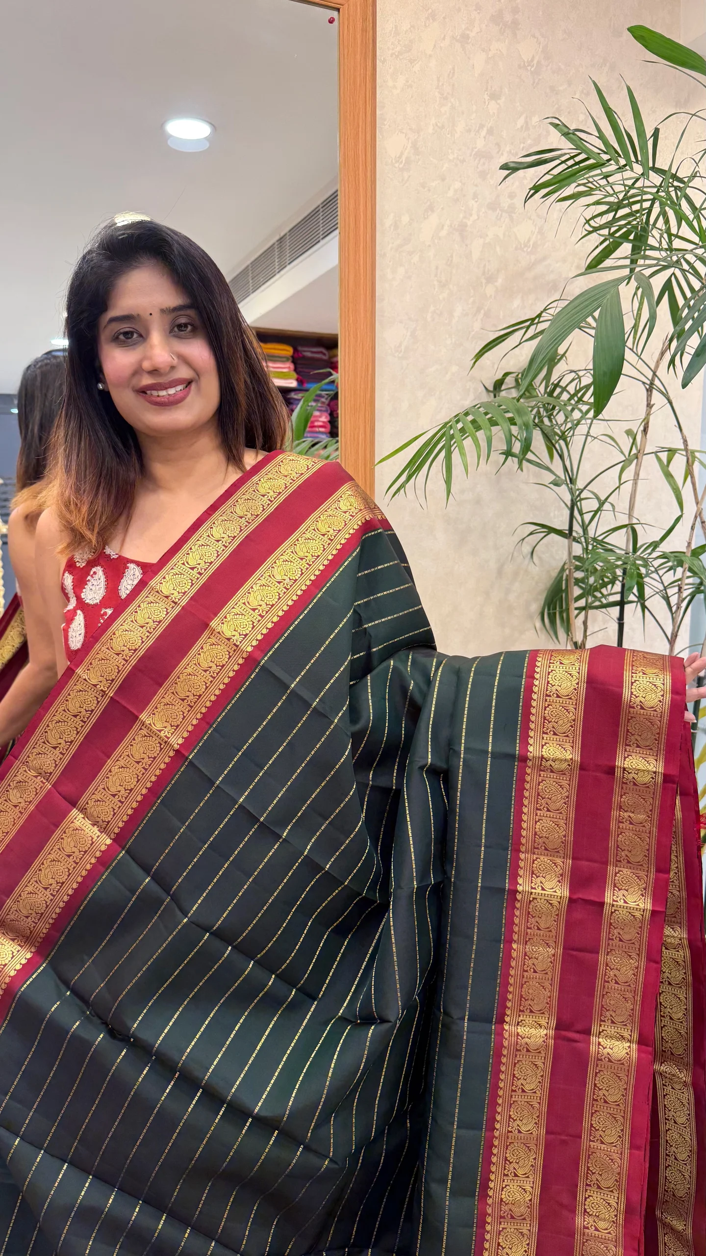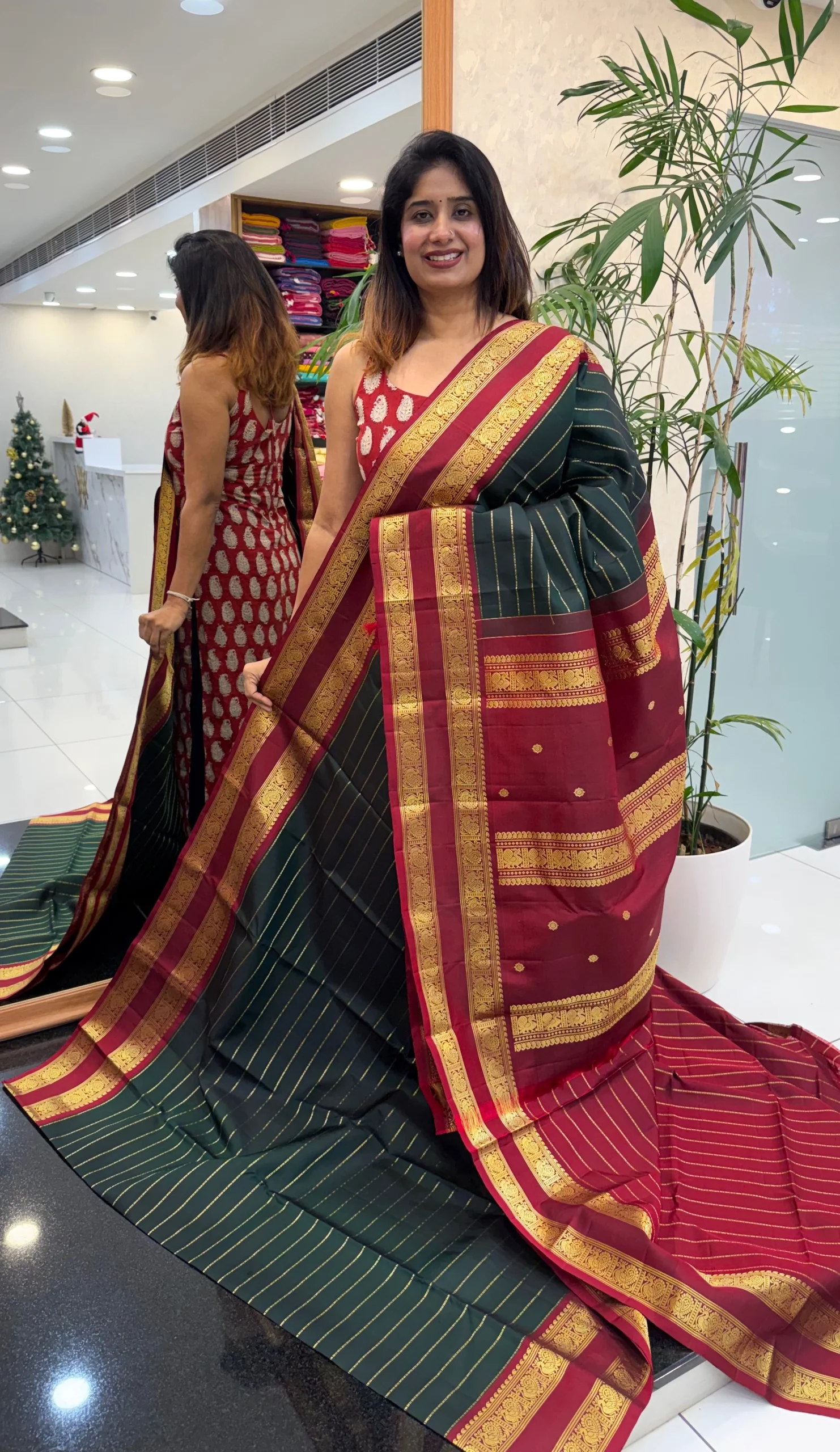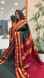 Crafted from smooth, premium silk, this saree offers a graceful drape and a natural sheen that makes it ideal for weddings, festive celebrations, religious ceremonies, and cultural occasions. The harmonious blend of deep green, maroon, and gold creates a classic look that never goes out of style.